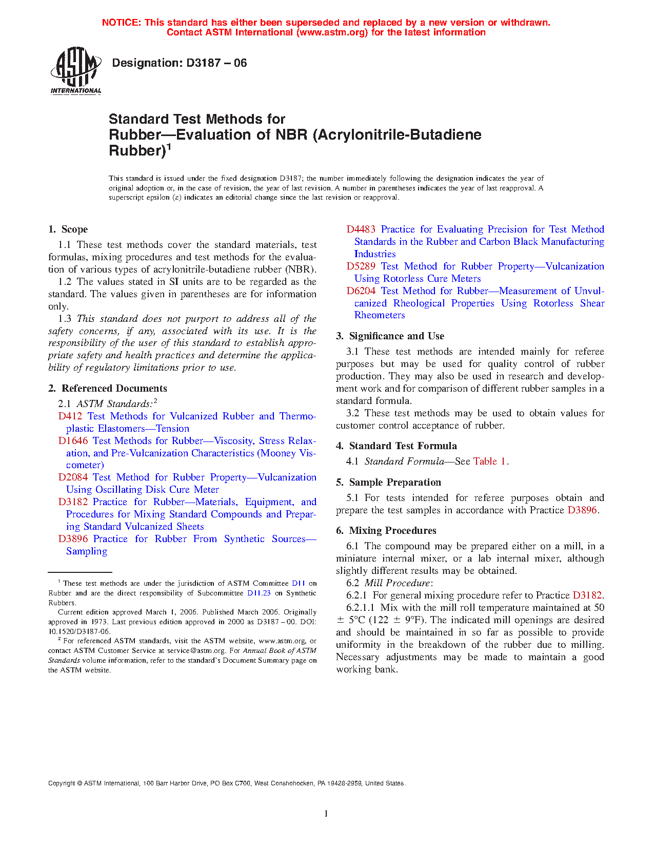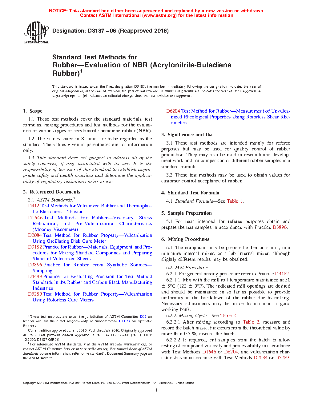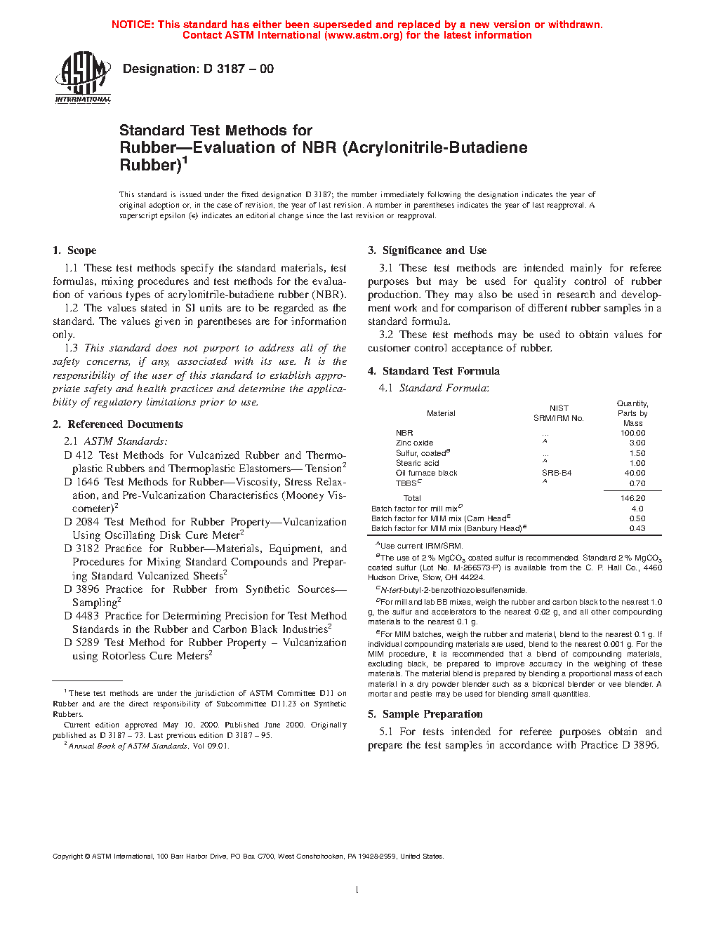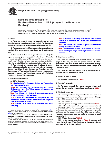 1.1 These test methods cover the standard materials, test formulas, mixing procedures and test methods for the evaluation of various types of acrylonitrile-butadiene rubber (NBR).