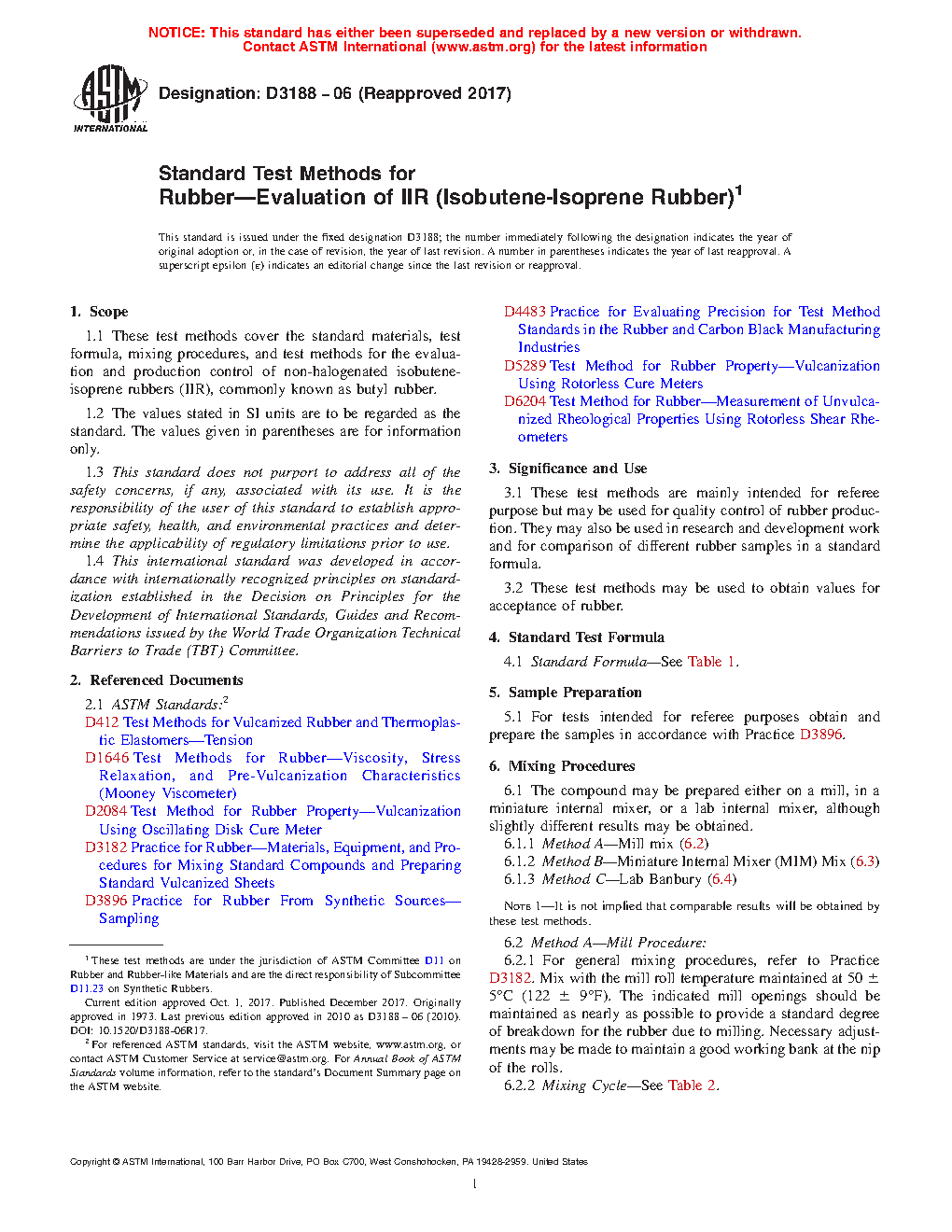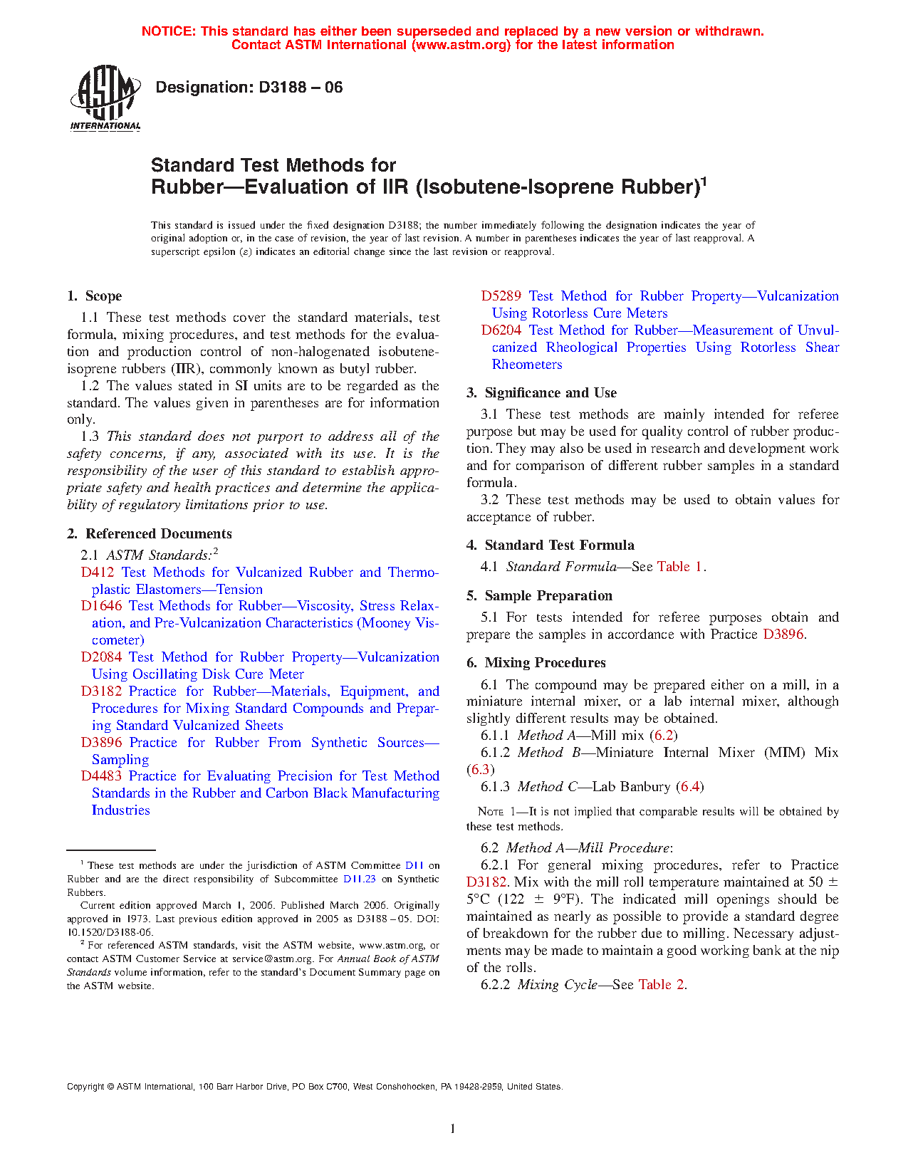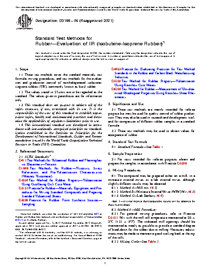 1.1 These test methods cover the standard materials, test formula, mixing procedures, and test methods for the evaluation and production control of non-halogenated isobutene-isoprene rubbers (IIR), commonly known as butyl rubber.