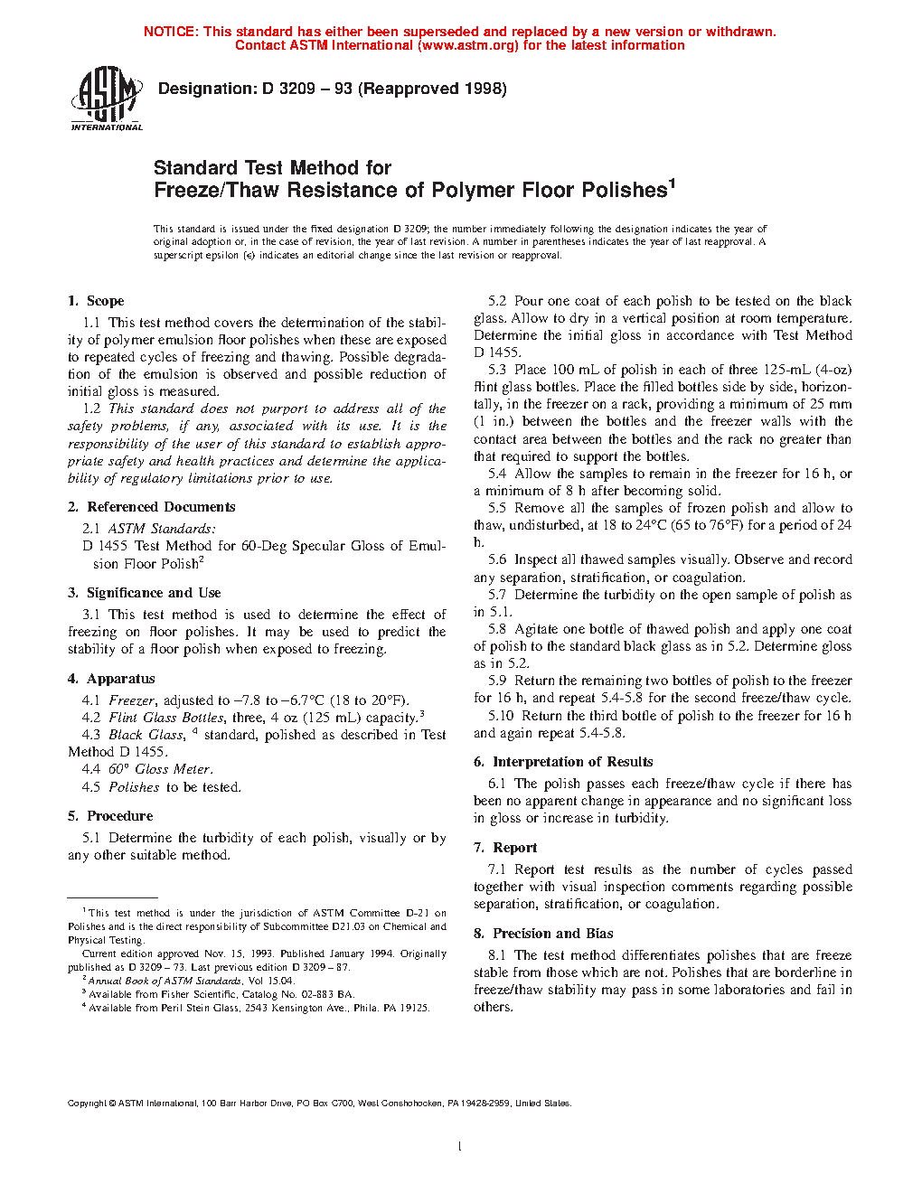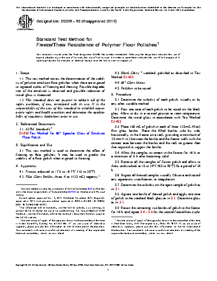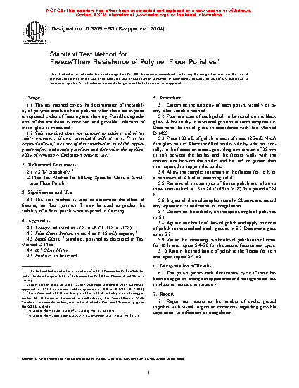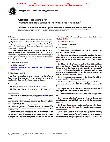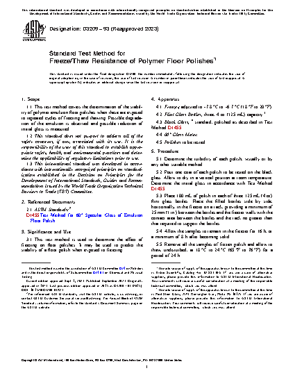 3.1 This test method is used to determine the effect of freezing on floor polishes. It may be used to predict the stability of a floor polish when exposed to freezing.