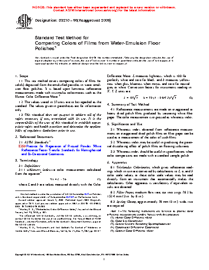 1.1 This test method covers comparing colors of films (or solids) deposited from the emulsified particles in water emulsion floor polishes. It is based upon luminous reflectance measurements made with tristimulus colorimeters such as the Hunter Color Difference Meter.2
