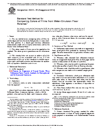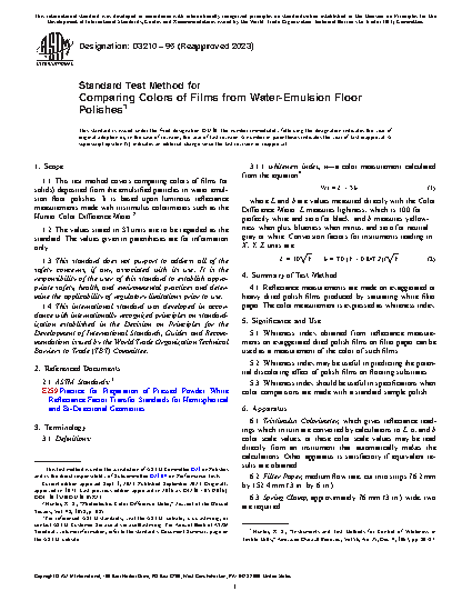 1.1 This test method covers comparing colors of films (or solids) deposited from the emulsified particles in water emul- sion floor polishes. It is based upon luminous reflectance measurements made with tristimulus colorimeters such as the Hunter Color Difference Meter.