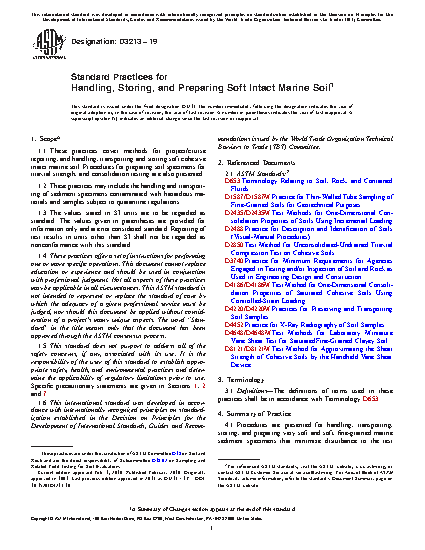 1.1 These practices cover methods for project/cruise reporting, and handling, transporting and storing soft cohesive intact marine soil. Procedures for preparing soil specimens for triaxial strength, and consolidation testing are also presented.