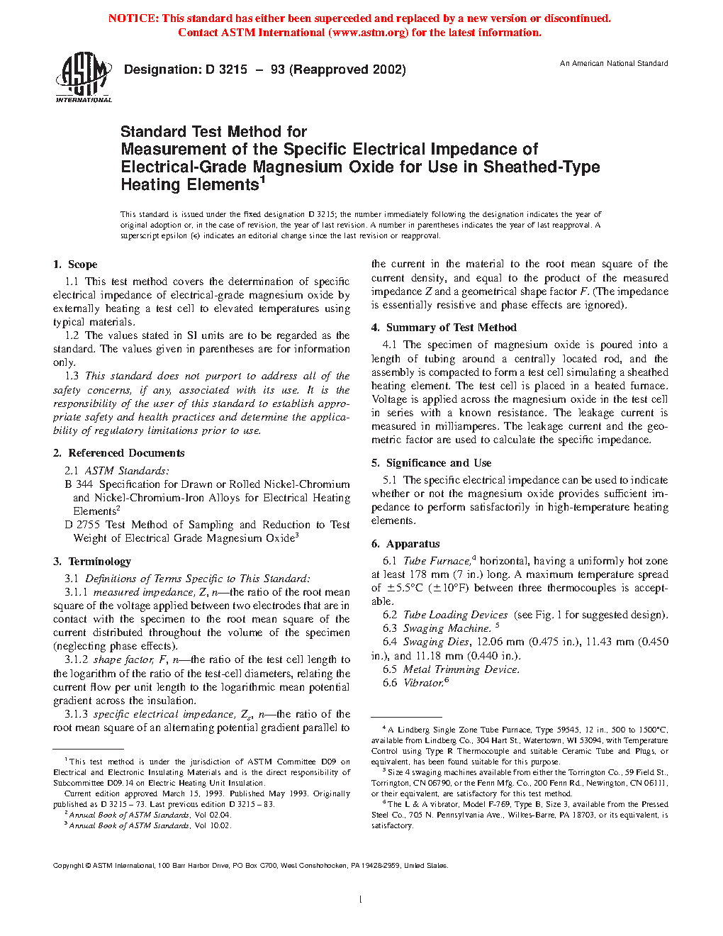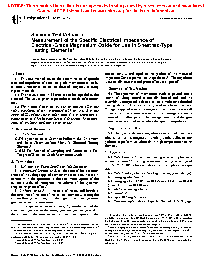 Standard Test Method for Measurement of the Specific Electrical Impedance of Electrical-Grade Magnesium Oxide for Use in Sheathed-Type Heating Elements (Withdrawn 2003)