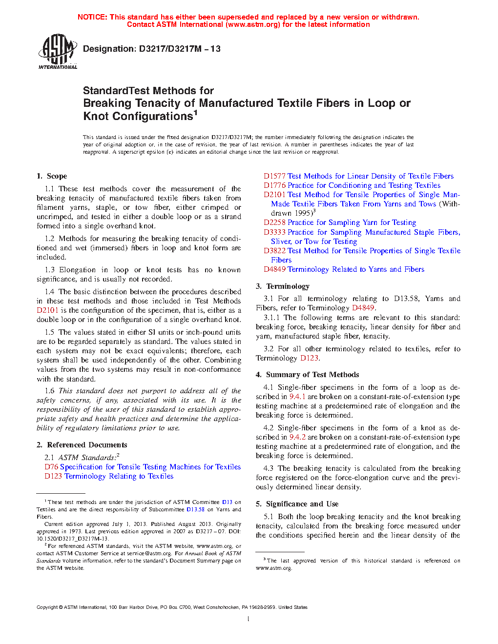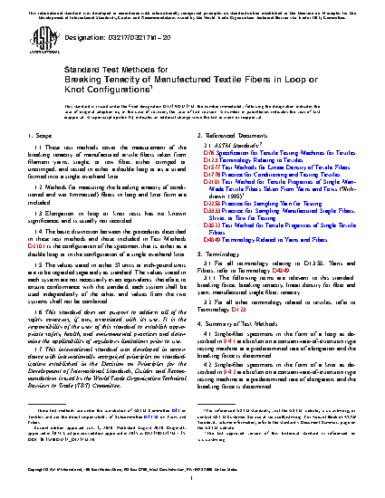 1.2 Methods for measuring the breaking tenacity of conditioned and wet (immersed) fibers in loop and knot form are included.