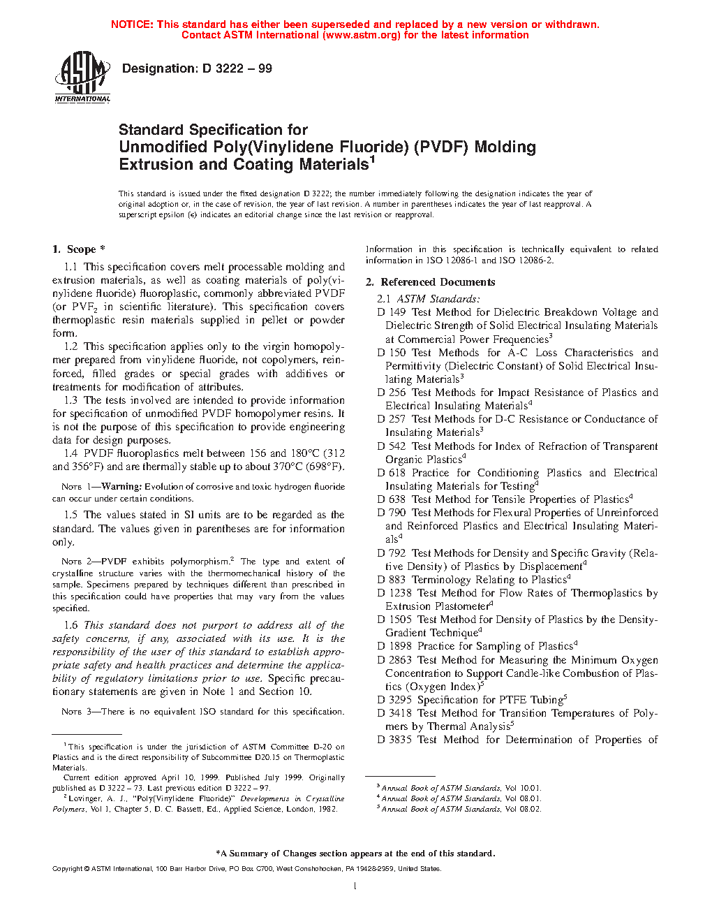 Note 1: PVDF exhibits polymorphism.2 The type and extent of crystalline structure varies with the thermomechanical history of the sample. Specimens prepared by techniques different than prescribed in this specification can have properties that vary from the values specified.