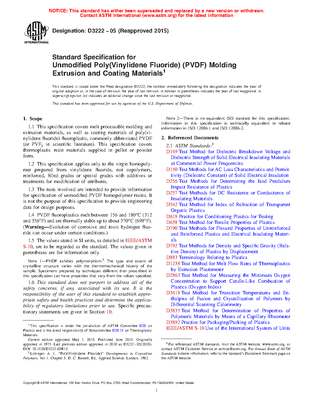 1.2 This specification applies only to the virgin homopolymer prepared from vinylidene fluoride, not copolymers, reinforced, filled grades or special grades with additives or treatments for modification of attributes.