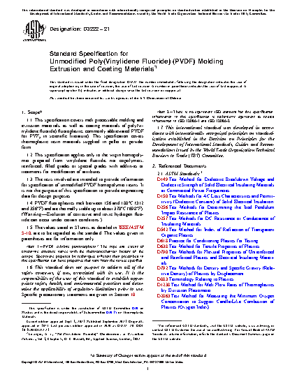 1.1 This specification covers melt processable molding and extrusion materials, as well as coating materials of poly(vinylidene fluoride) fluoroplastic, commonly abbreviated PVDF (or PVF2 in scientific literature). This specification covers thermoplastic resin materials supplied in pellet or powder form.