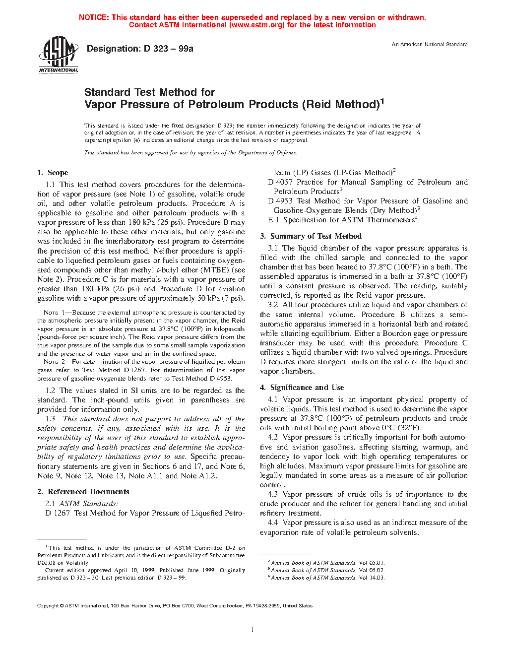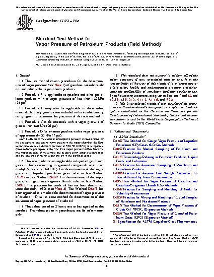 1.1 This test method covers procedures for the determination of vapor pressure (see Note 1) of gasoline, volatile crude oil, and other volatile petroleum products.