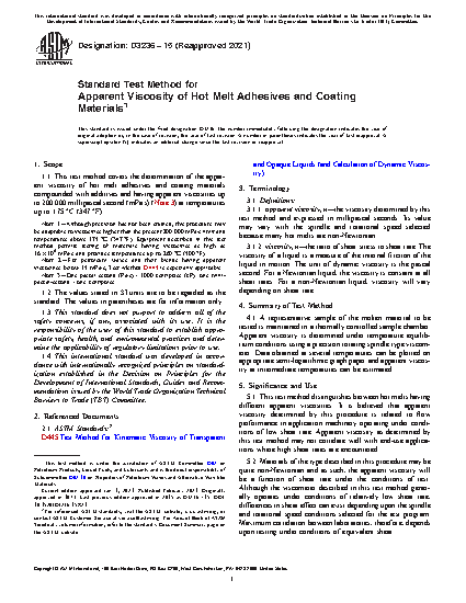 1.1 This test method covers the determination of the apparent viscosity of hot melt adhesives and coating materials compounded with additives and having apparent viscosities up to 200 000 millipascal second (mPa·s) (Note 3) at temperatures up to 175 °C (347 °F).
