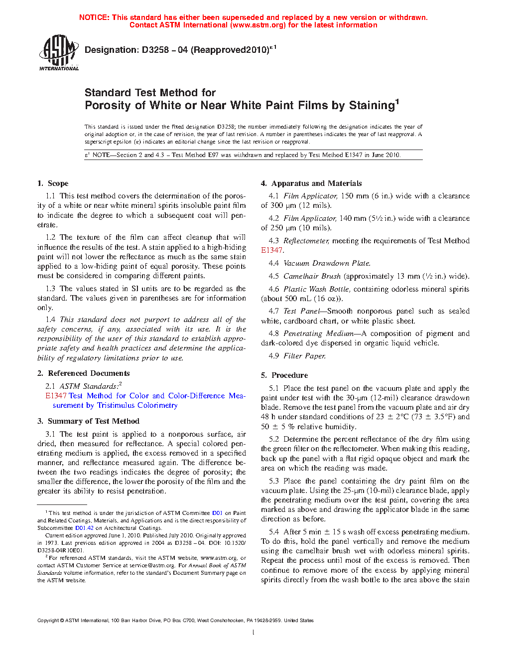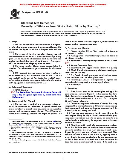 1.1 This test method covers the determination of the porosity of a white or near white mineral spirits insoluble paint film to indicate the degree to which a subsequent coat will penetrate.