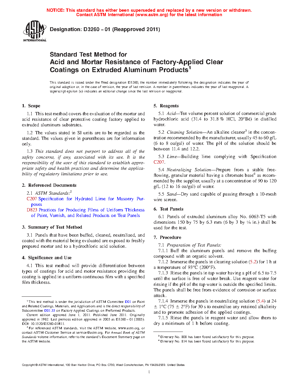 1.1 This test method covers the evaluation of the mortar and acid resistance of clear protective coating factory applied to extruded aluminum substrates.