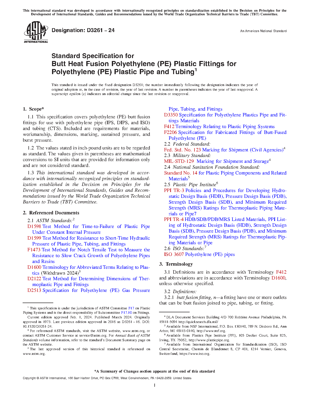 This specification covers polyethylene (PE) butt fusion fittings for use with polyethylene pipe (IPS and ISO) and tubing (CTS). Included are requirements for materials, workmanship, dimensions, marking, sustained pressure, and burst pressure. Pressure strength test shall be performed to meet the requirements prescribed.