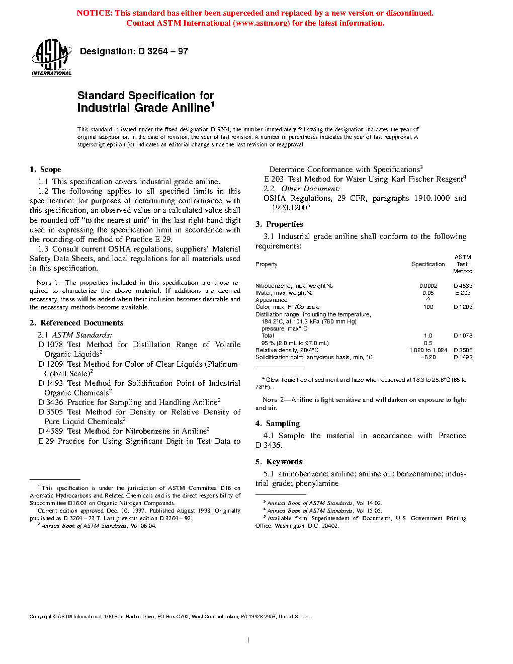 Standard Specification for Industrial Grade Aniline (Withdrawn 2003)
