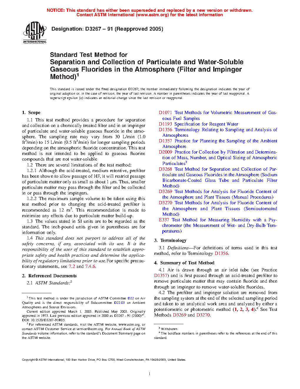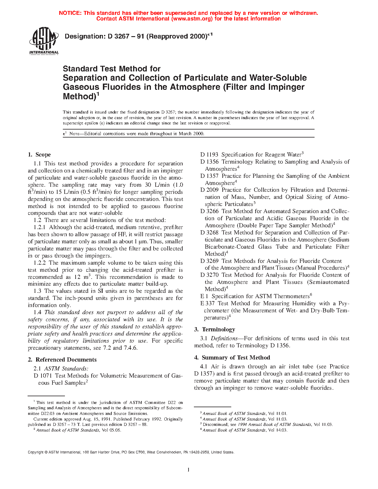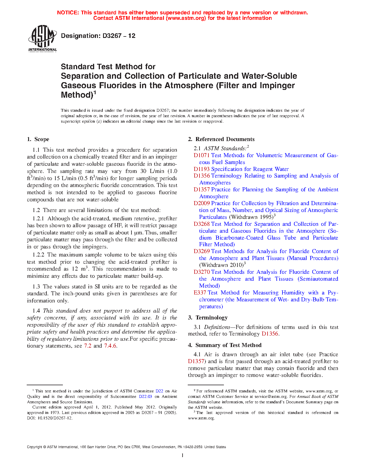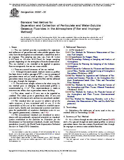 1.1 This test method provides a procedure for separation and collection of particulate and water-soluble gaseous fluorides from the atmosphere on a chemically treated filter and in an impinger. The sampling rate may vary from 30 L/min (1.0 ft3/min) to 15 L/min (0.5 ft3/min) for longer sampling periods depending on the atmospheric fluoride concentration. This test method is not intended to be applied to gaseous fluorine compounds that are not water-soluble.