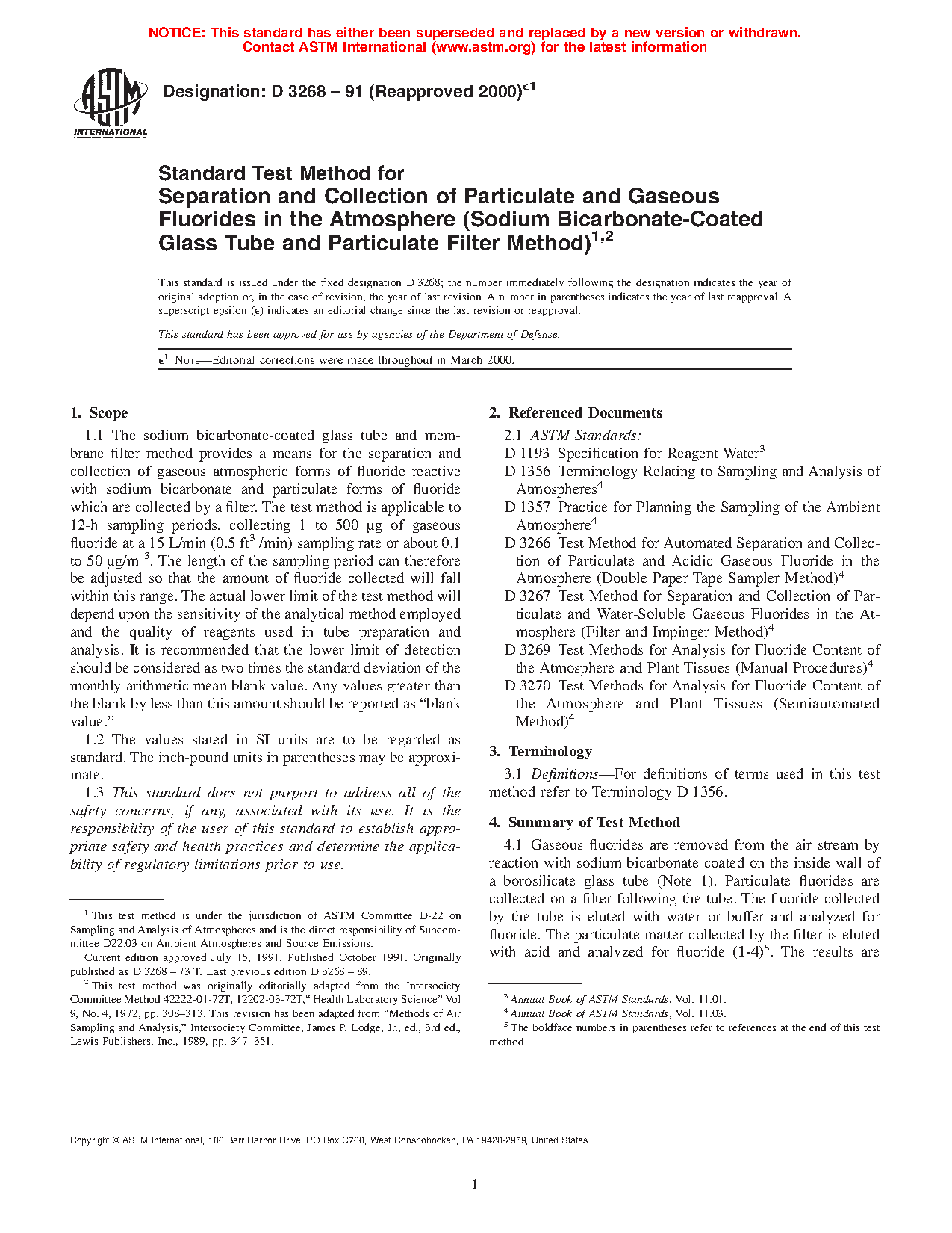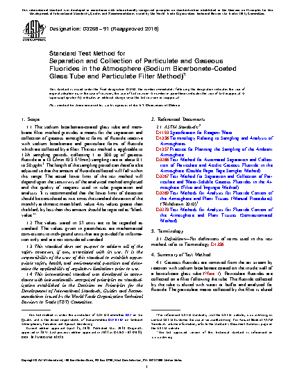1.1 The sodium bicarbonate-coated glass tube and membrane filter method provides a means for the separation and collection of gaseous atmospheric forms of fluoride reactive with sodium bicarbonate and particulate forms of fluoride which are collected by a filter. The test method is applicable to 12-h sampling periods, collecting 1 to 500 μg of gaseous fluoride at a 15 L/min (0.5 ft3/min) sampling rate or about 0.1 to 50 μg/m3. The length of the sampling period can therefore be adjusted so that the amount of fluoride collected will fall within this range. The actual lower limit of the test method will depend upon the sensitivity of the analytical method employed and the quality of reagents used in tube preparation and analysis. It is recommended that the lower limit of detection should be considered as two times the standard deviation of the monthly arithmetic mean blank value. Any values greater than the blank by less than this amount should be reported as “blank value.”