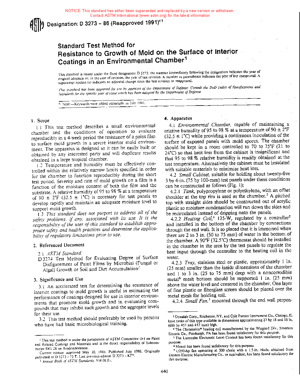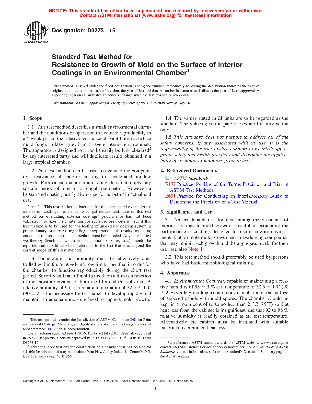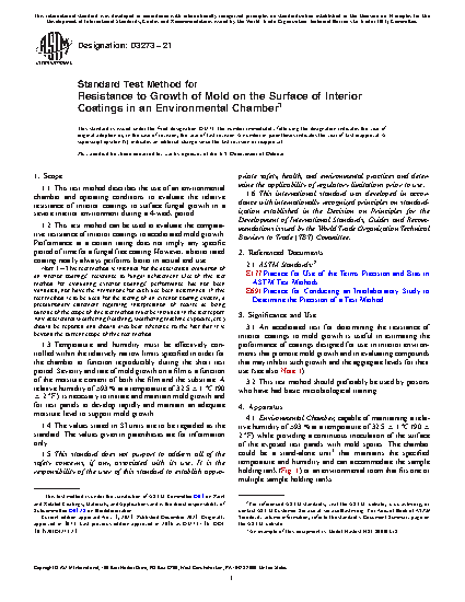 1.3 Temperature and humidity must be effectively controlled within the relatively narrow limits specified in order for the chamber to function reproducibly during the short test period. Severity and rate of mold growth on a film is a function of the moisture content of both the film and the substrate. A relative humidity of 95 ± 3 % at a temperature of 32.5 ± 1°C (90 ± 2°F ) is necessary for test panels to develop rapidly and maintain an adequate moisture level to support mold growth.