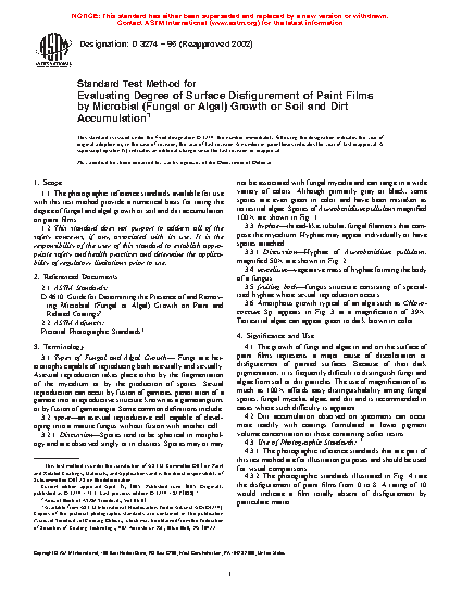 1.1 Fungal growth, frequently referred to as mildew in the paint industry, causes defacement of paint film exposed outdoors. The visual rating of paint surface disfigurement due to fungal or algal attack is required in order to compare the performance of different coatings.