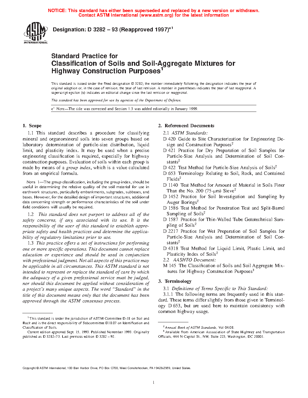 1.1 This practice covers a procedure for classifying mineral and organomineral soils into seven groups based on laboratory determination of particle-size distribution, liquid limit, and plasticity index. It may be used when a precise engineering classification is required, especially for highway construction purposes. Evaluation of soils within each group is made by means of a group index, which is a value calculated from an empirical formula.