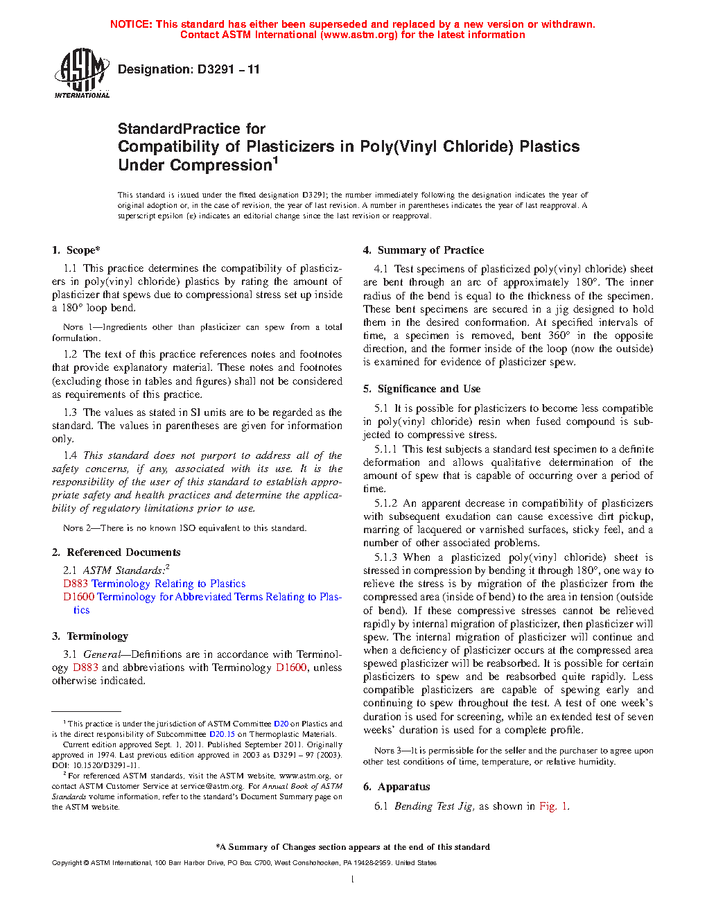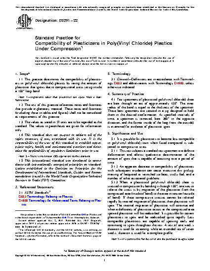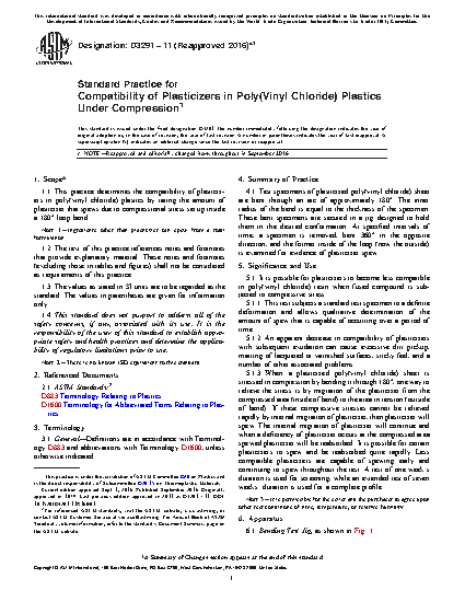 1.1 This practice determines the compatibility of plasticizers in poly(vinyl chloride) plastics by rating the amount of plasticizer that spews due to compressional stress set up inside a 180 loop bend.