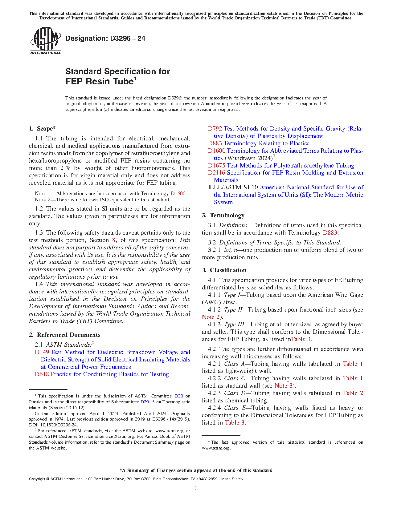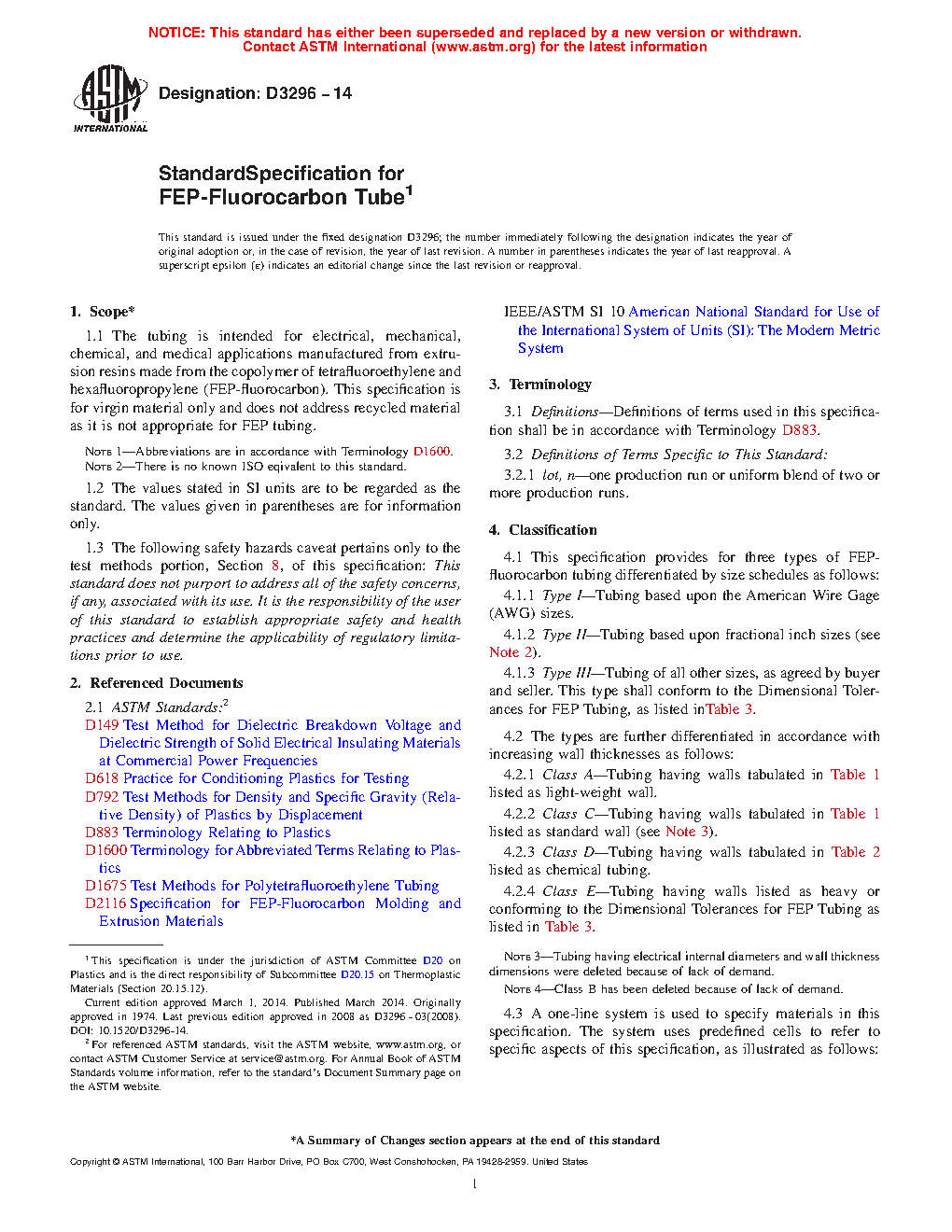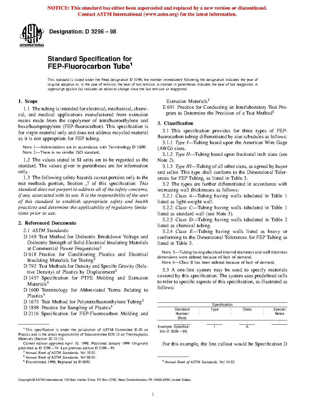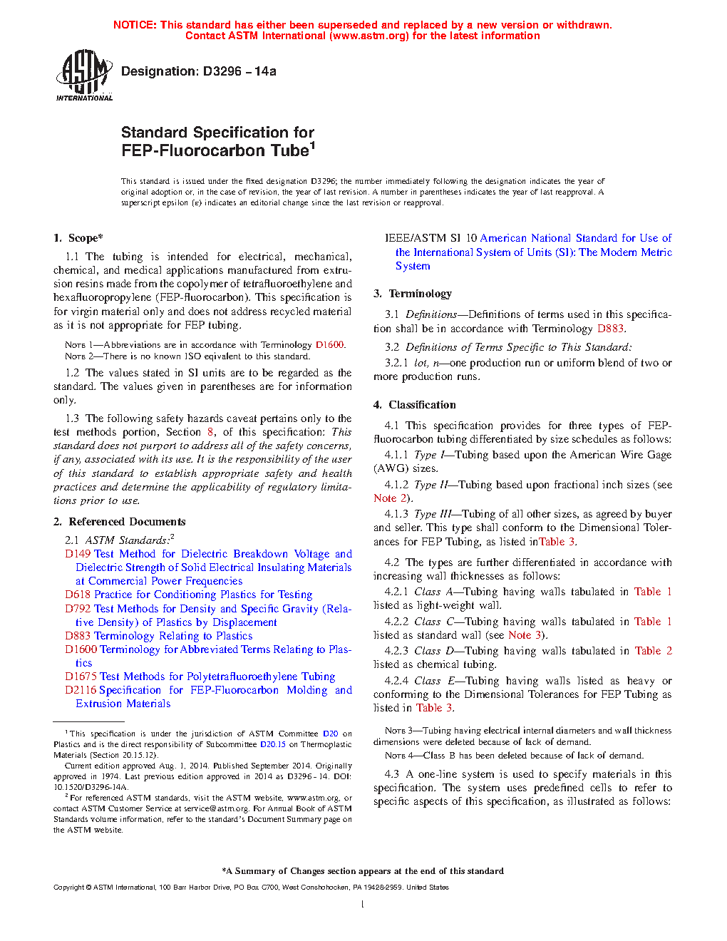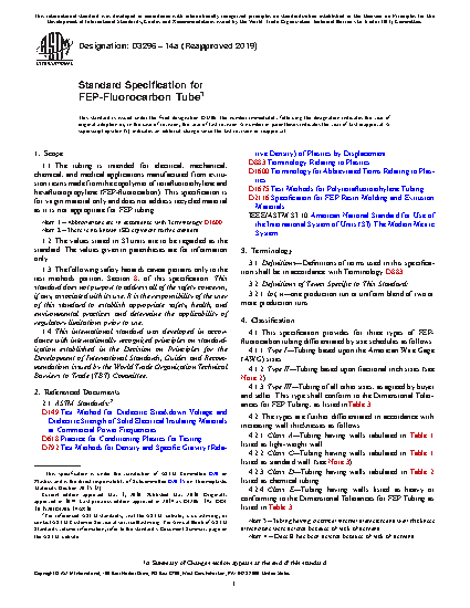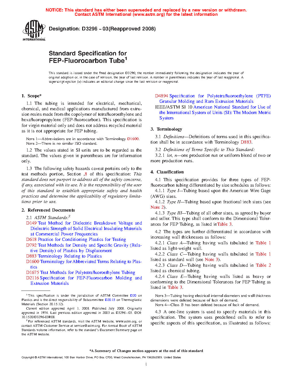 1.1 The tubing is intended for electrical, mechanical, chemical, and medical applications manufactured from extrusion resins made from the copolymer of tetrafluoroethylene and hexafluoropropylene (FEP-fluorocarbon). This specification is for virgin material only and does not address recycled material as it is not appropriate for FEP tubing.