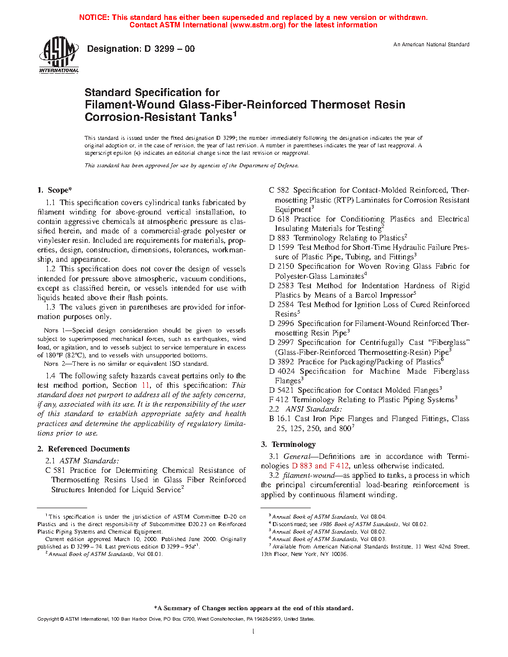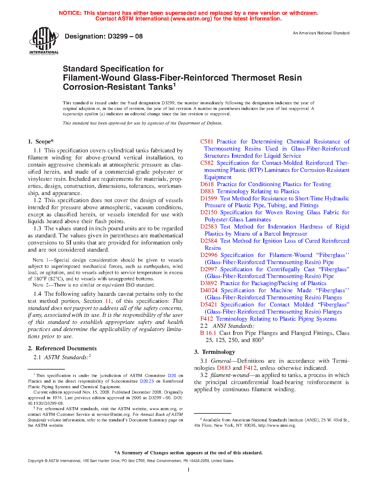 This specification covers cylindrical corrosion-resistant tanks made of commercial-grade glass-fiber-reinforced polyester or vinylester thermoset resin fabricated by filament winding for above-ground vertical installation, to contain aggressive chemicals at atmospheric pressure as classified herein. This specification does not address the design of vessels intended for pressure above atmospheric, vacuum conditions, except as classified herein, or vessels intended for use with liquids heated above their flash points. Included are requirements for materials, properties, design, construction, dimensions, tolerances, workmanship, and appearance.