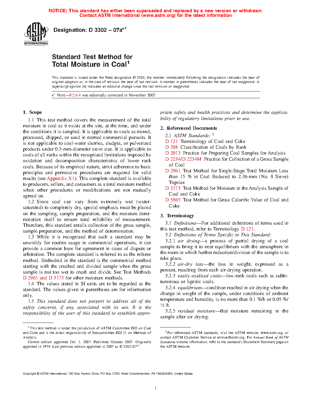 1.1 This test method covers the measurement of the total moisture in coal as it exists at the site, at the time, and under the conditions it is sampled. It is applicable to coals as mined, processed, shipped, or used in normal commercial pursuits. It is not applicable to coal-water slurries, sludges, or pulverized products under 0.5-mm-diameter sieve size. It is applicable to coals of all ranks within the recognized limitations imposed by oxidation and decomposition characteristics of lower rank coals. Because of its empirical nature, strict adherence to basic principles and permissive procedures are required for valid results (see Appendix X1). This complete standard is available to producers, sellers, and consumers as a total moisture method when other procedures or modifications are not mutually agreed on.