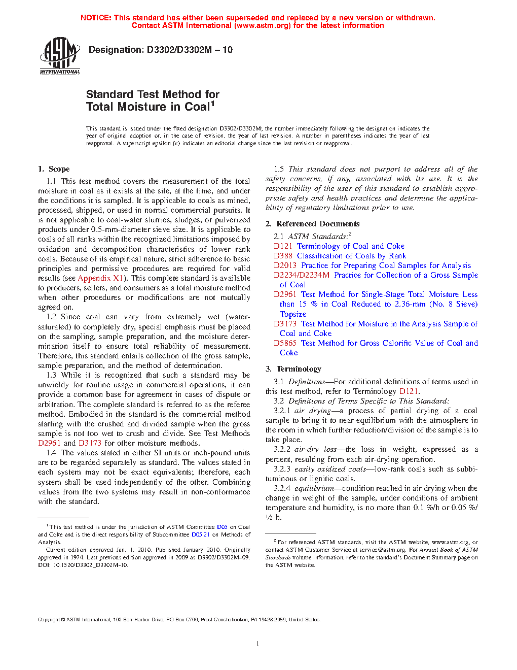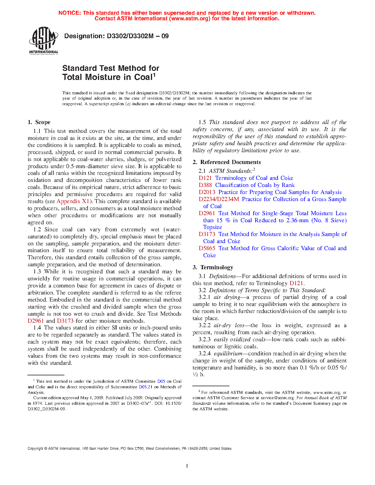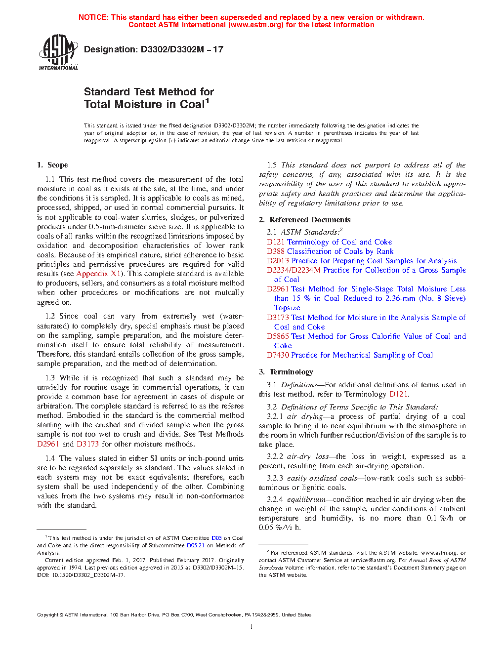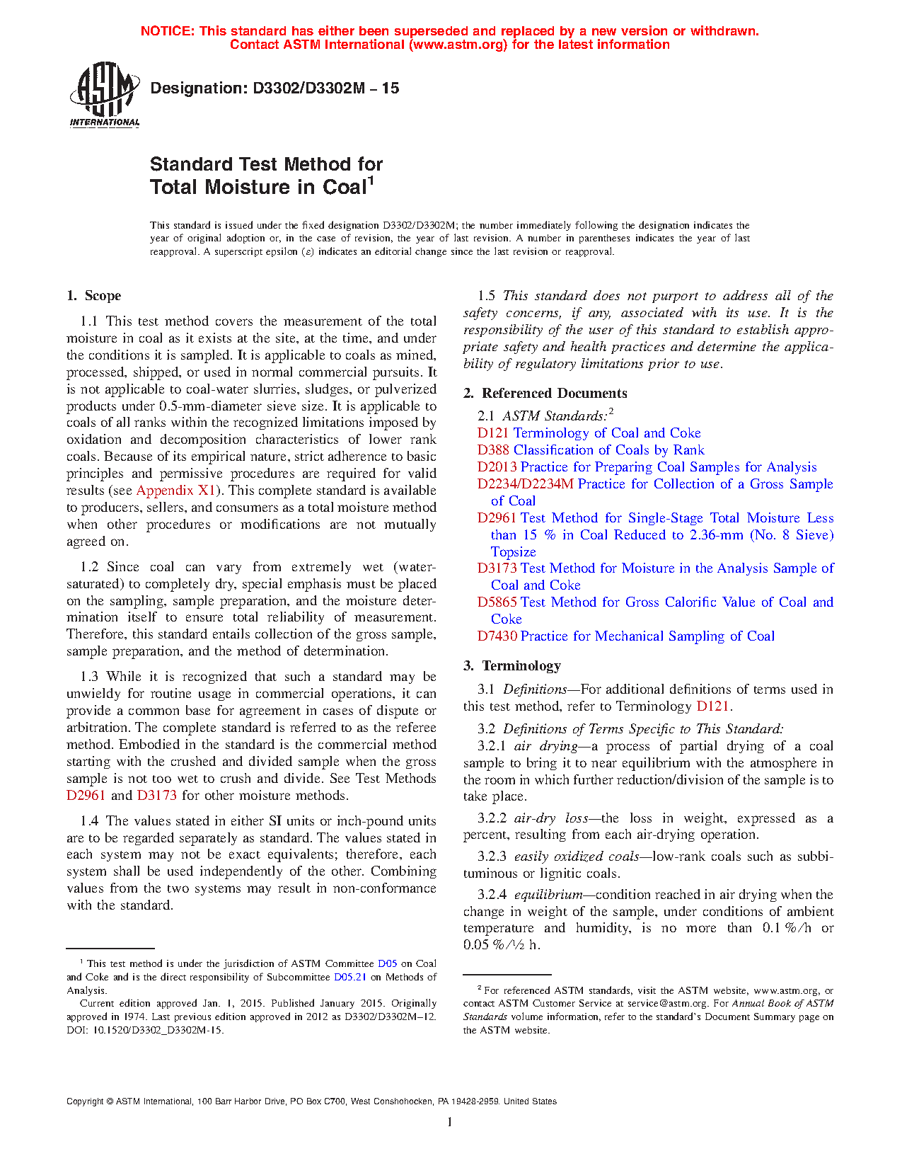 1.1 This test method covers the measurement of the total moisture in coal as it exists at the site, at the time, and under the conditions it is sampled. It is applicable to coals as mined, processed, shipped, or used in normal commercial pursuits. It is not applicable to coal-water slurries, sludges, or pulverized products under 0.5 mm-diameter sieve size. It is applicable to coals of all ranks within the recognized limitations imposed by oxidation and decomposition characteristics of lower rank coals. Because of its empirical nature, strict adherence to basic principles and permissive procedures are required for valid results (see Appendix X1). This complete standard is available to producers, sellers, and consumers as a total moisture method when other procedures or modifications are not mutually agreed on.