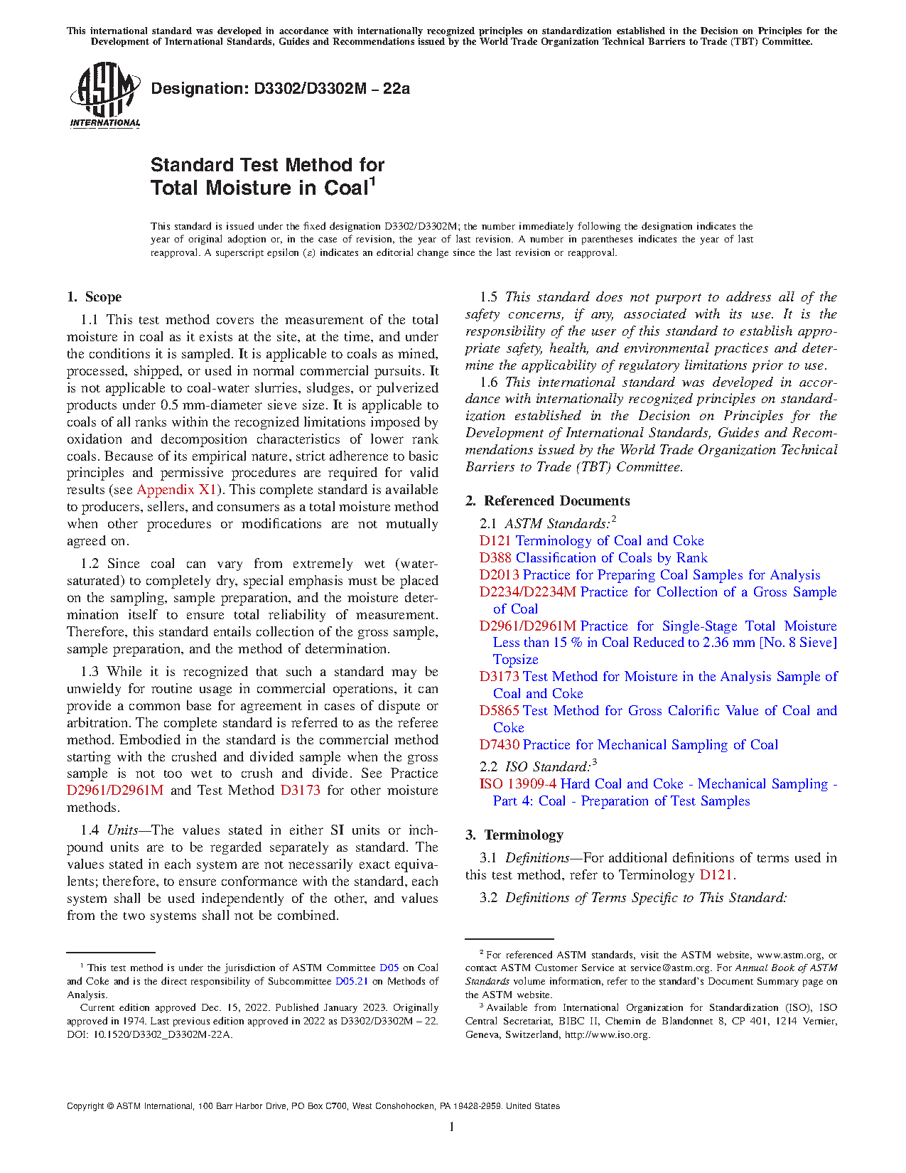 1.3 While it is recognized that such a standard may be unwieldy for routine usage in commercial operations, it can provide a common base for agreement in cases of dispute or arbitration. The complete standard is referred to as the referee method. Embodied in the standard is the commercial method starting with the crushed and divided sample when the gross sample is not too wet to crush and divide. See Practice D2961/D2961M and Test Method D3173 for other moisture methods.