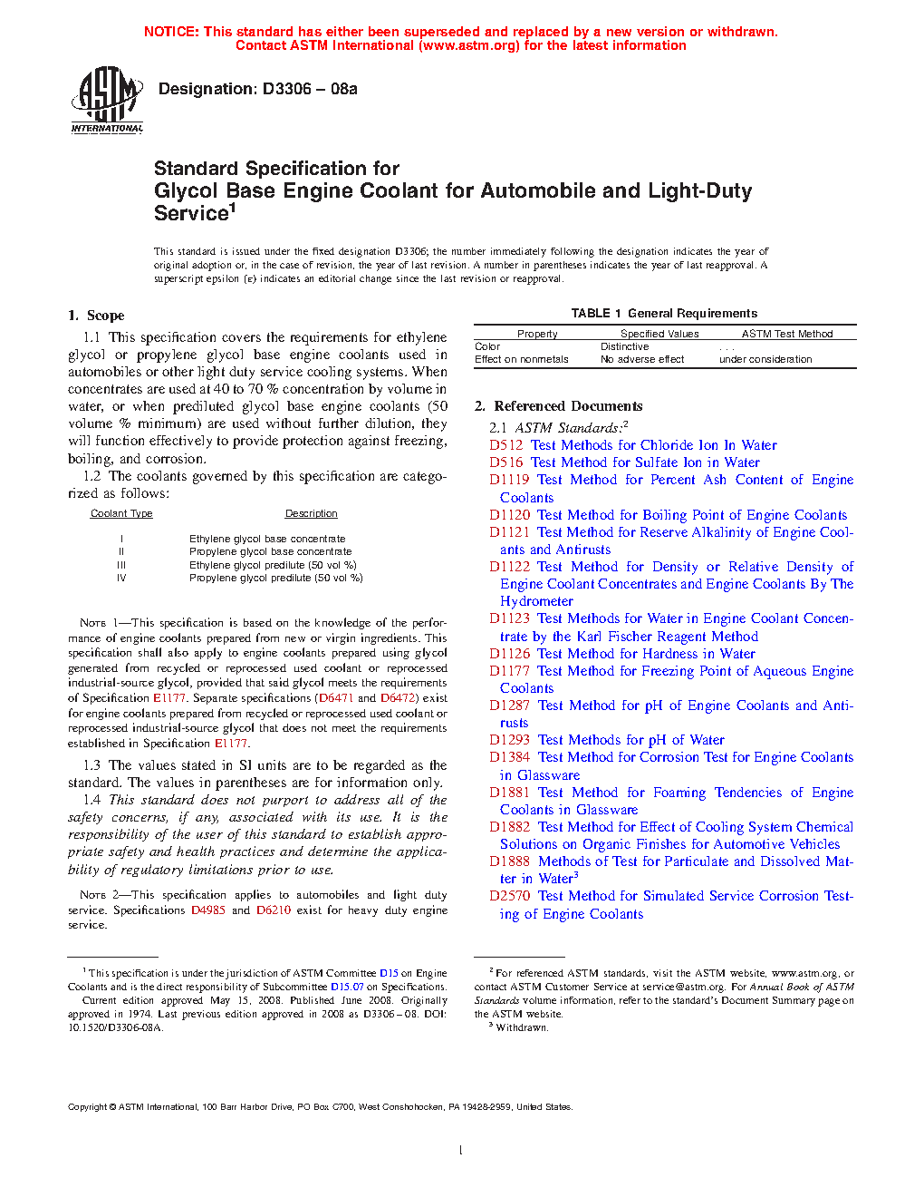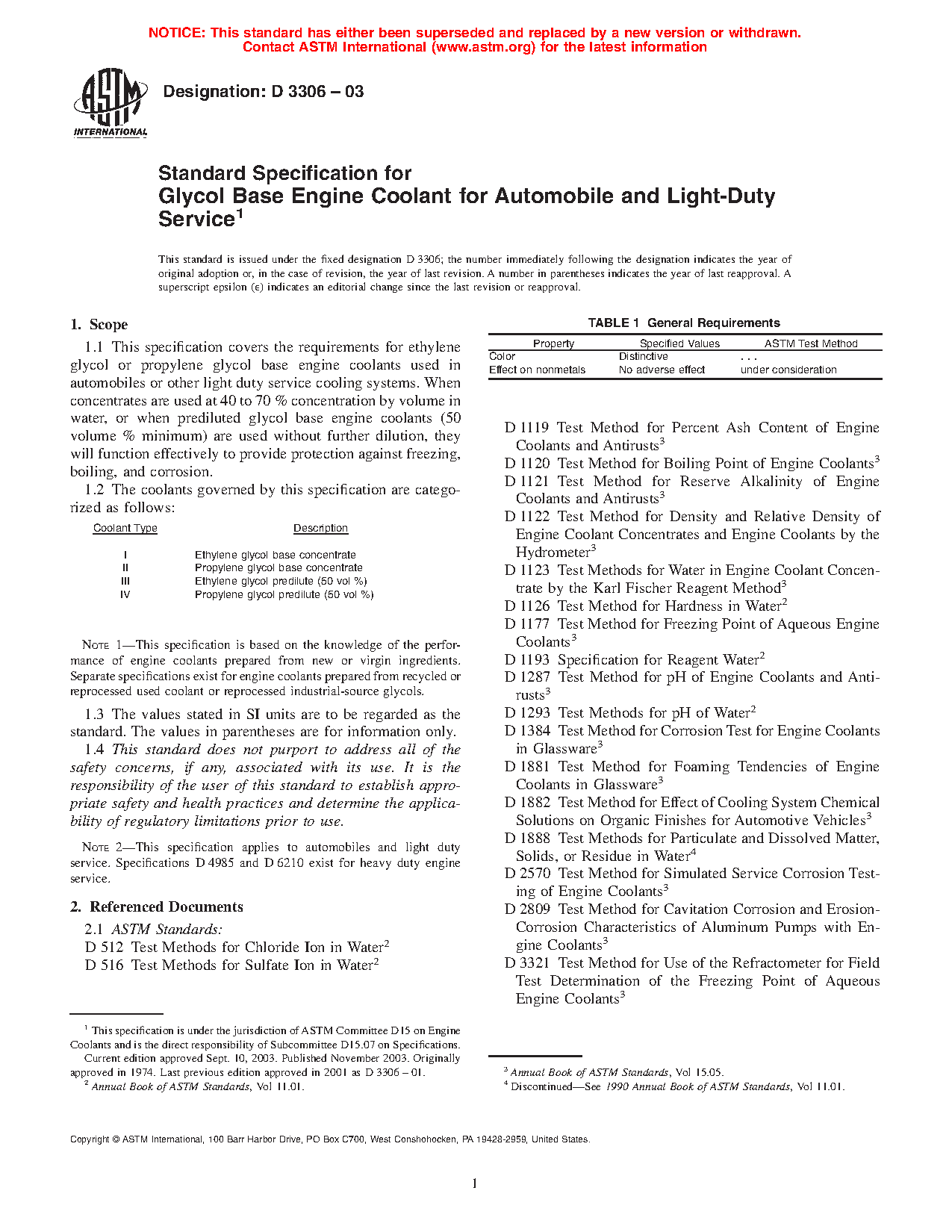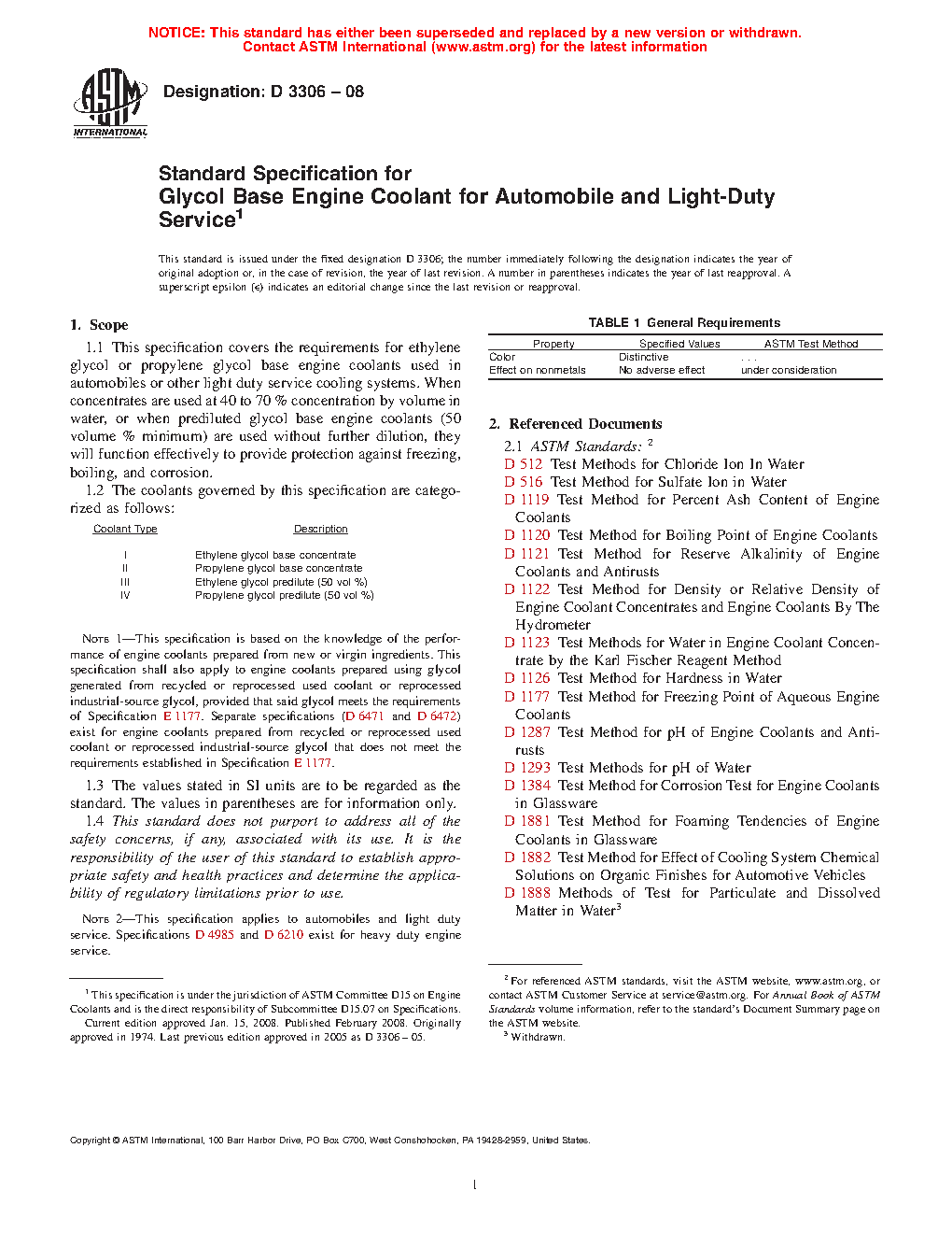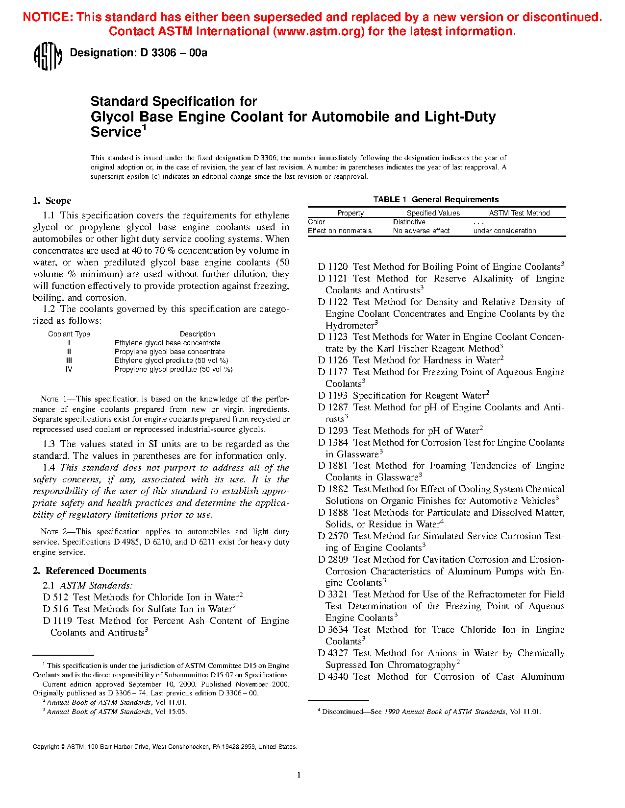 Note 1--This specification is based on the knowledge of the performance of engine coolants prepared from new or virgin ingredients. Separate specifications exist for engine coolants prepared from recycled or reprocessed used coolant or reprocessed industrial-source glycols.