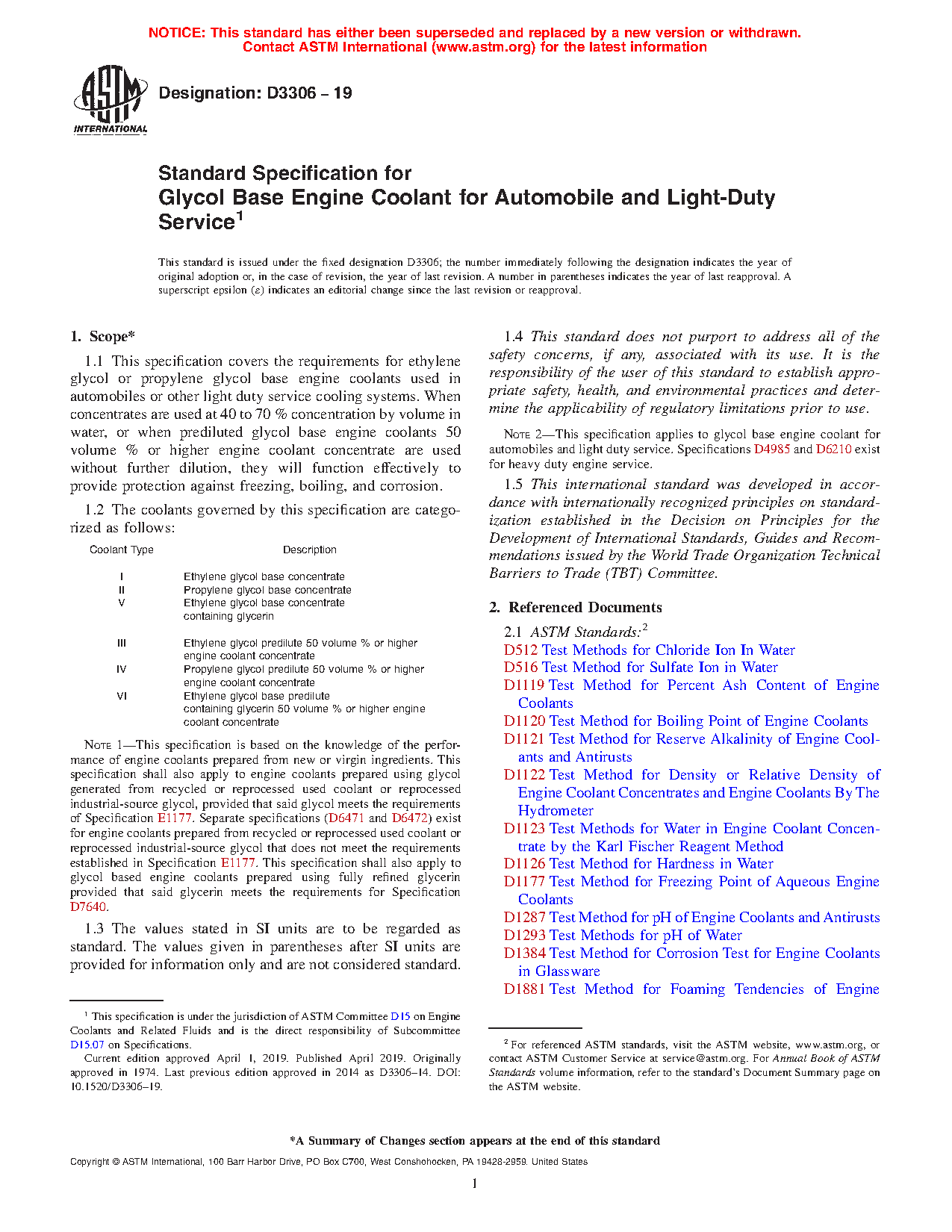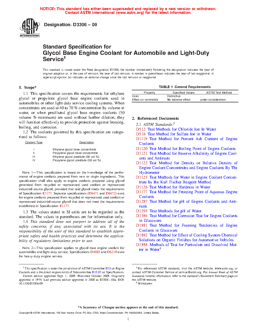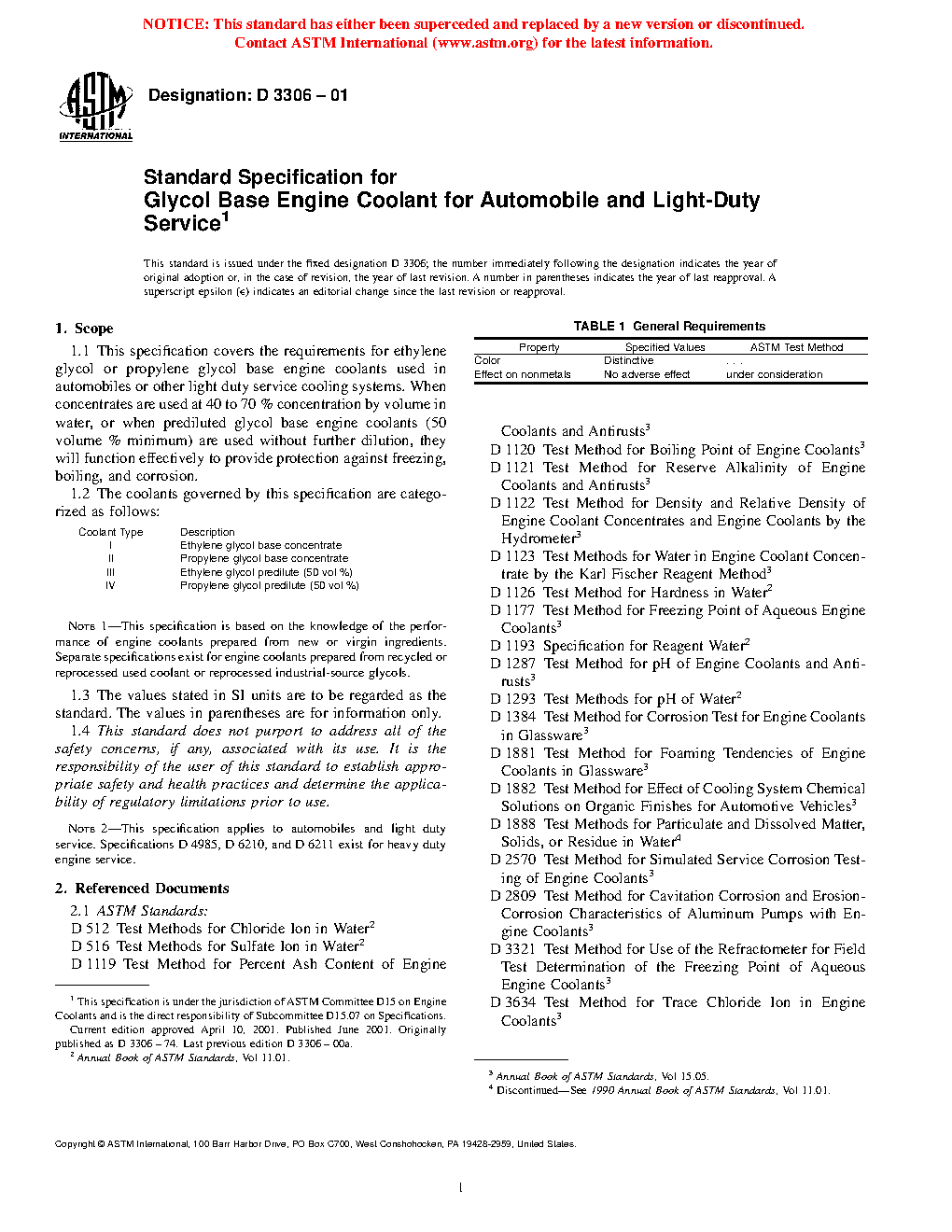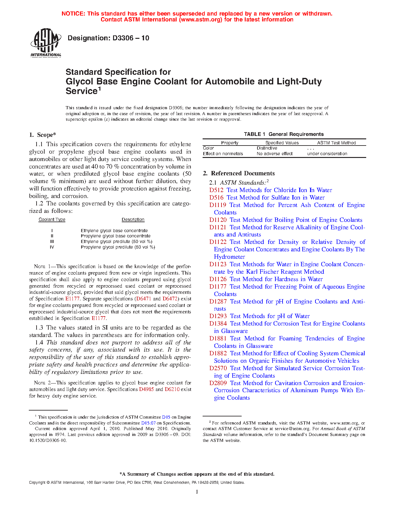 Note 1--This specification is based on the knowledge of the performance of engine coolants prepared from new or virgin ingredients. Separate specifications exist for engine coolants prepared from recycled or reprocessed used coolant or reprocessed industrial-source glycols.
