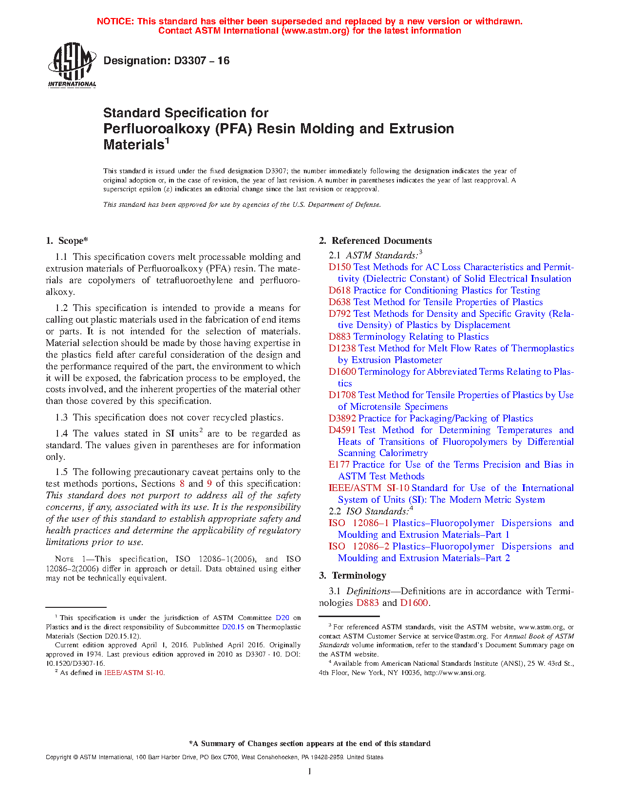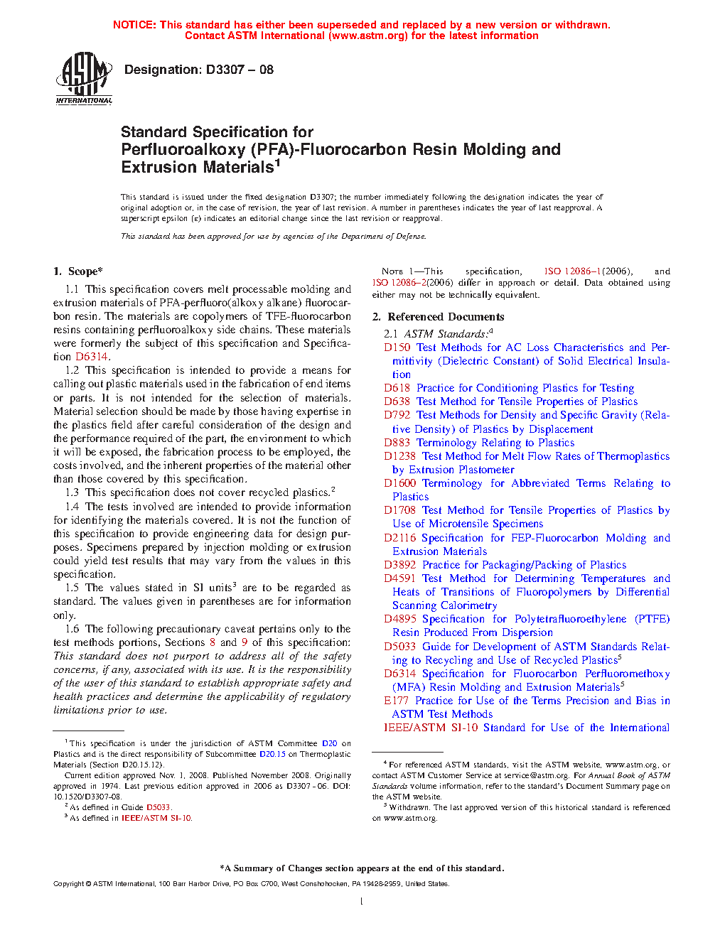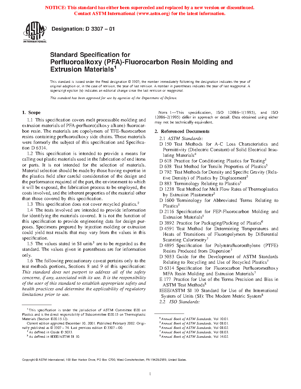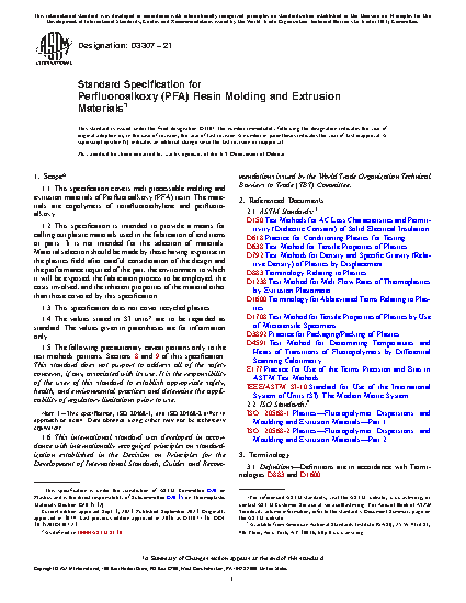 1.1 This specification covers melt processable molding and extrusion materials of Perfluoroalkoxy (PFA) resin. The materials are copolymers of tetrafluoroethylene and perfluoroalkoxy.