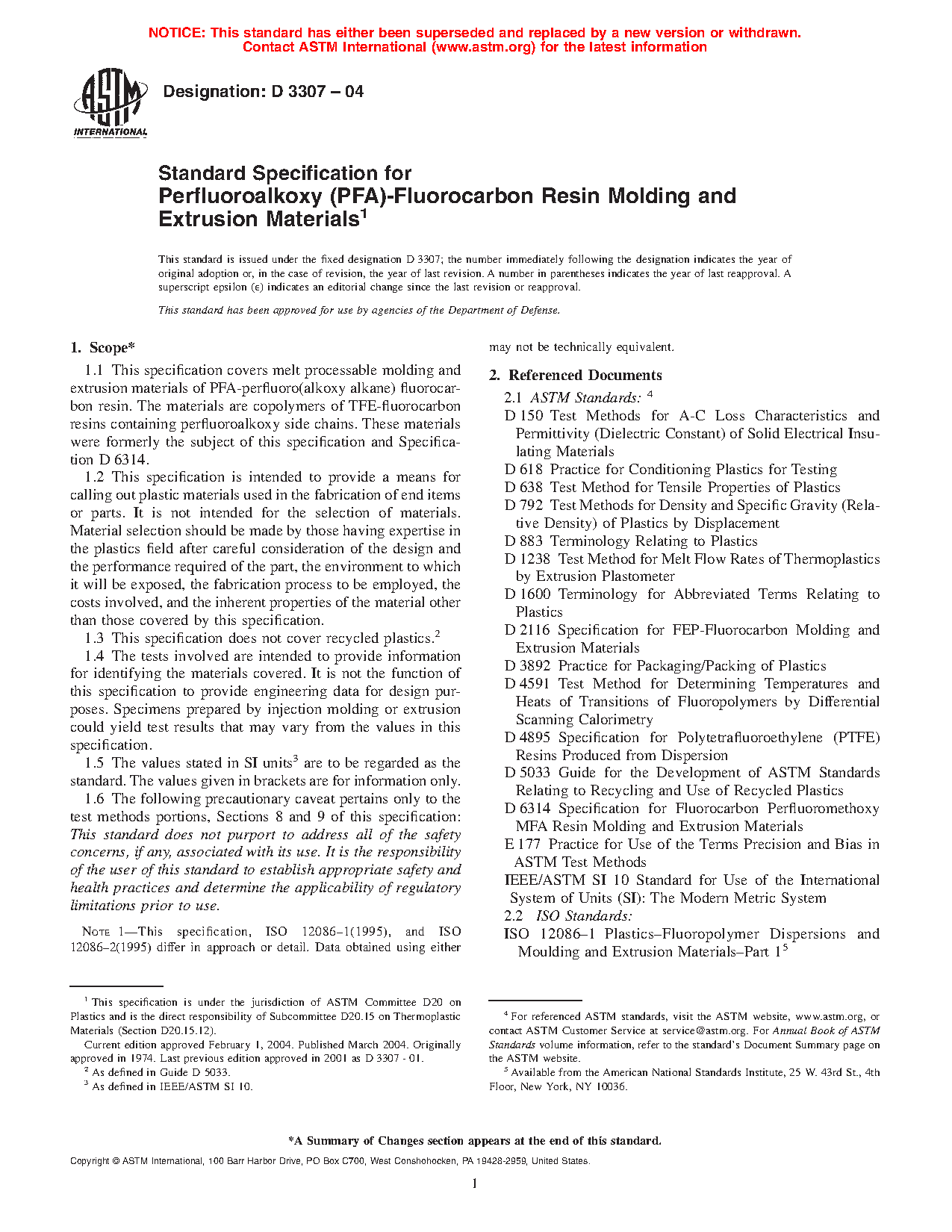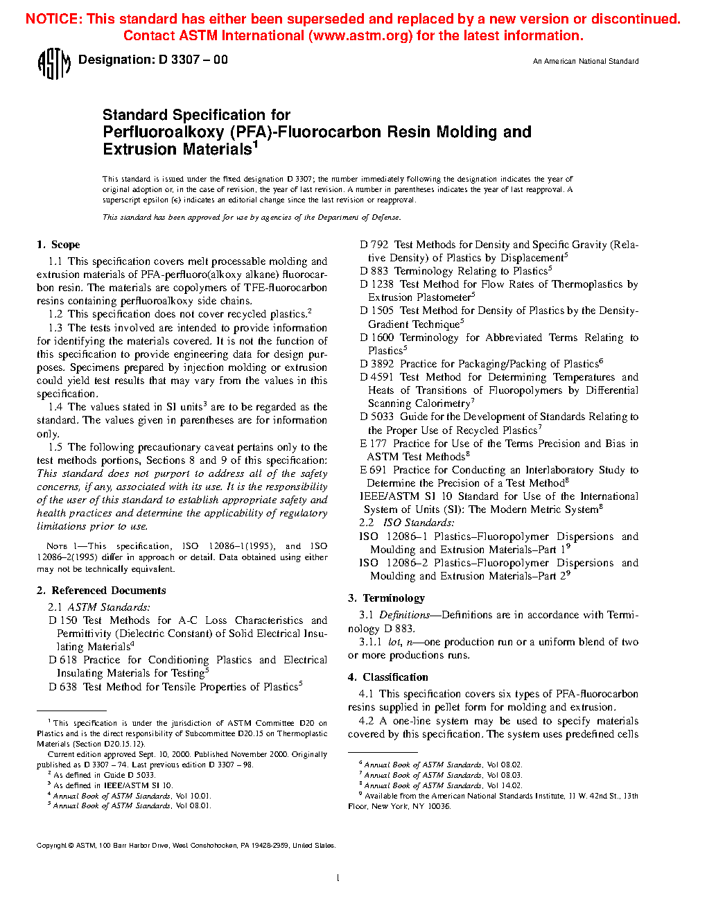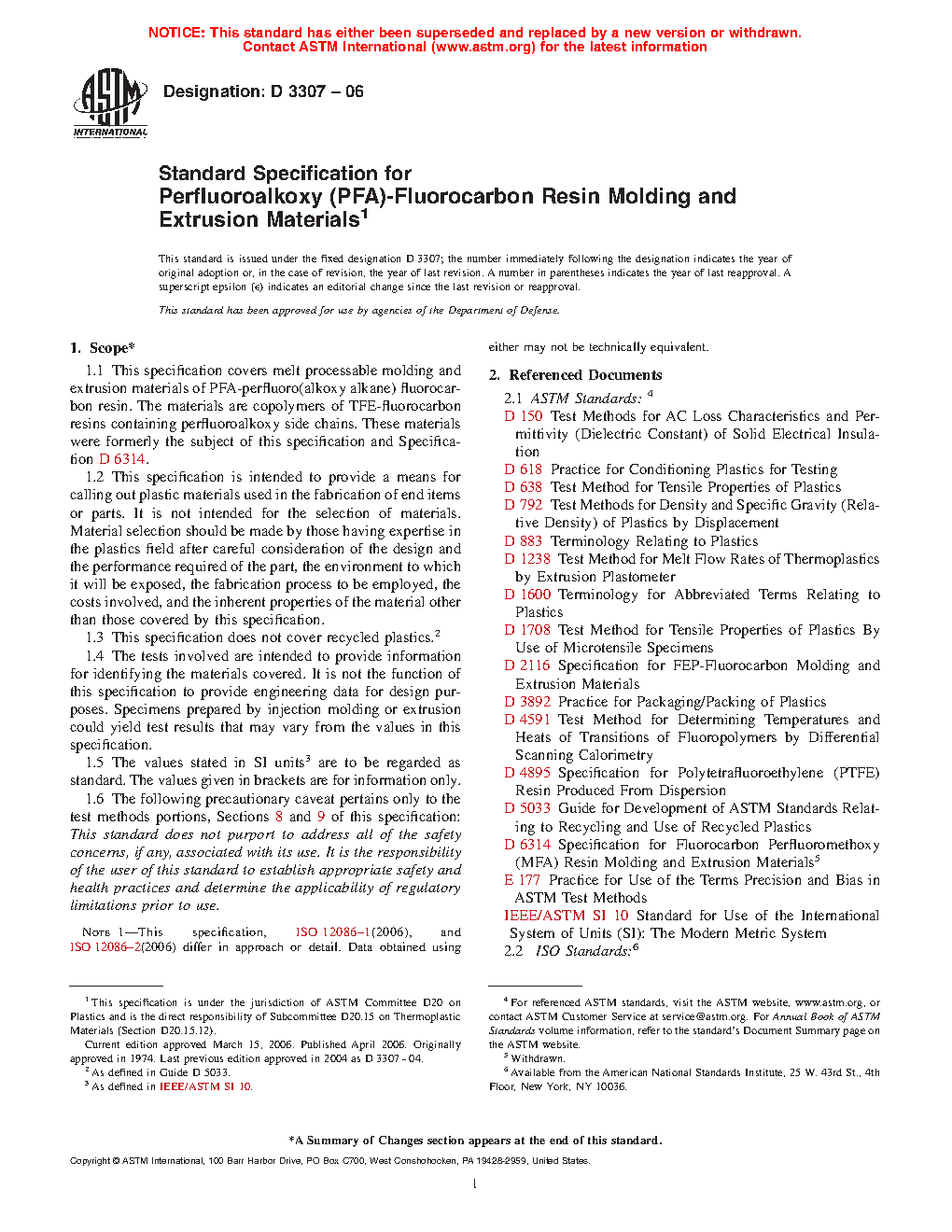 1.1 This specification covers melt processable molding and extrusion materials of Perfluoroalkoxy (PFA) resin. The materials are copolymers of tetrafluoroethylene and perfluoroalkoxy.