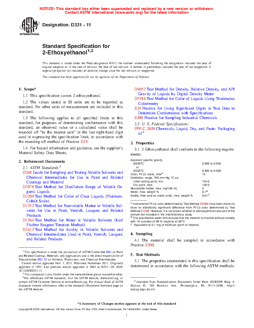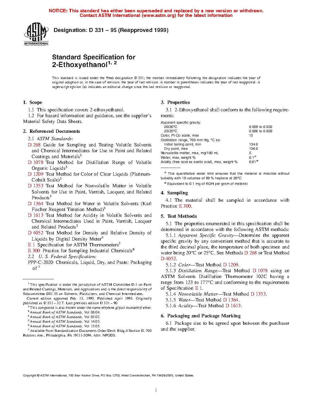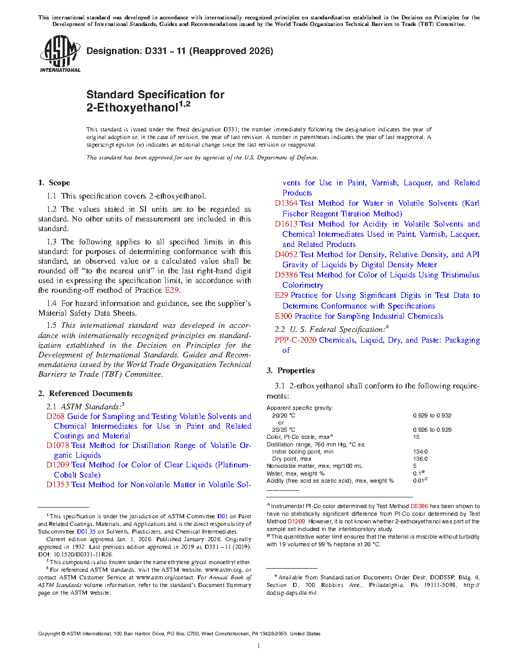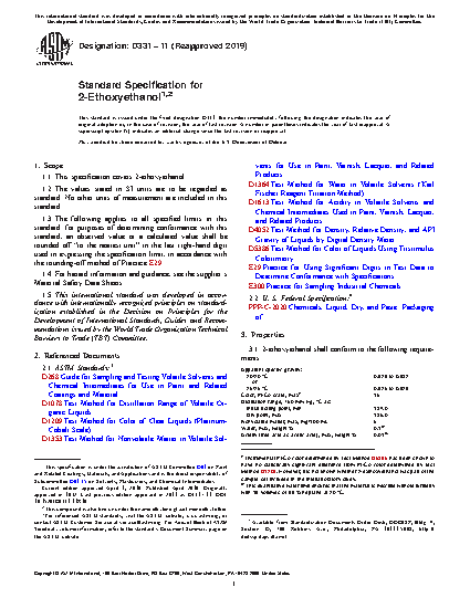 This specification covers properties and test methods for 2-ethoxyethanol. 2-ethoxyethanol shall be tested and conform with specific gravity, color, distillation range, nonvolatile matter, water, and acidity indicated in the specification. Packaging shall conform to the specification.