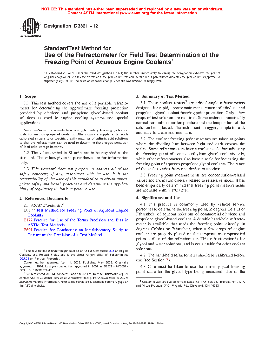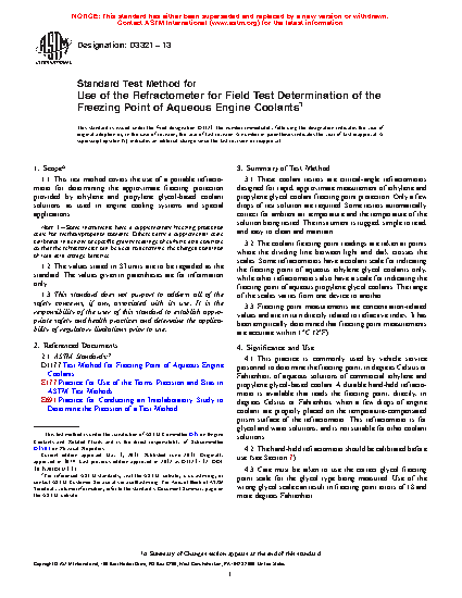 1.1 This test method covers the use of a portable refractometer for determining the approximate freezing protection provided by ethylene and propylene glycol-based coolant solutions as used in engine cooling systems and special applications.