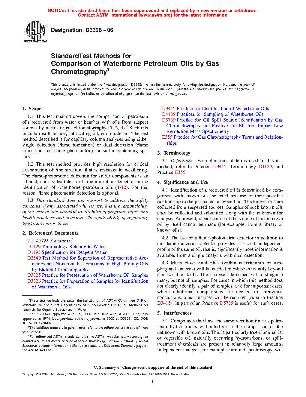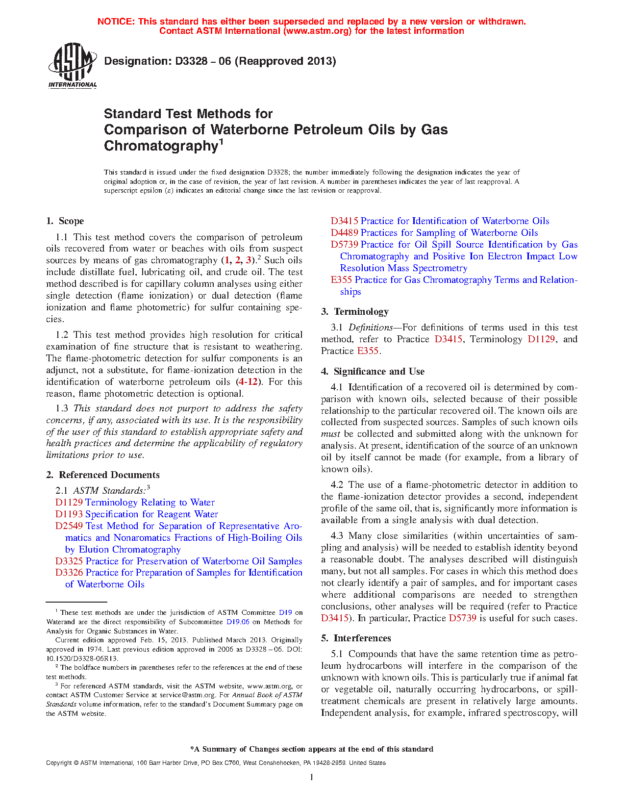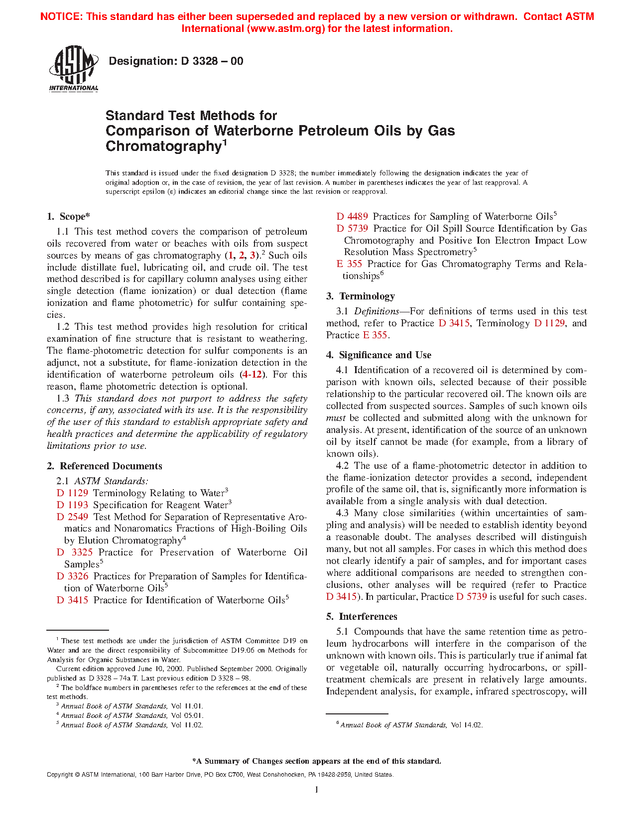 1.1 This test method covers the comparison of petroleum oils recovered from water or beaches with oils from suspect sources by means of gas chromatography (1-3).2 Such oils include distillate fuel, lubricating oil, and crude oil. The test method described is for capillary column analyses using either single detection (flame ionization) or dual detection (flame ionization and flame photometric) for sulfur containing species.