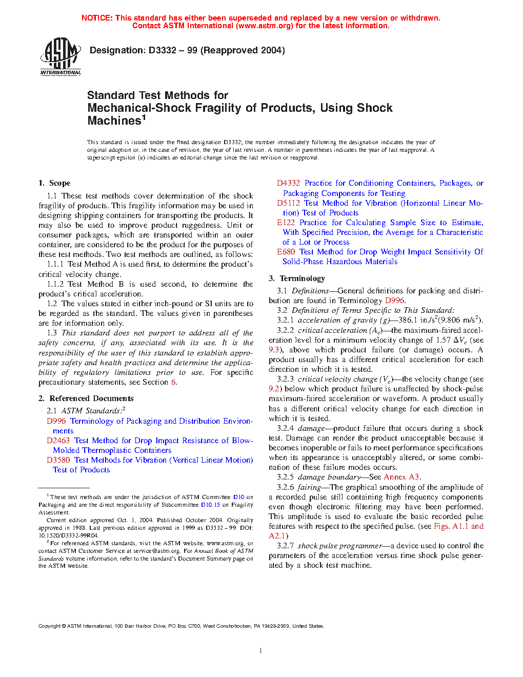 1.1 These test methods cover determination of the shock fragility of products. This fragility information may be used in designing shipping containers for transporting the products. It may also be used to improve product ruggedness. Unit or consumer packages, which are transported within an outer container, are considered to be the product for the purposes of these test methods. Two test methods are outlined, as follows:
