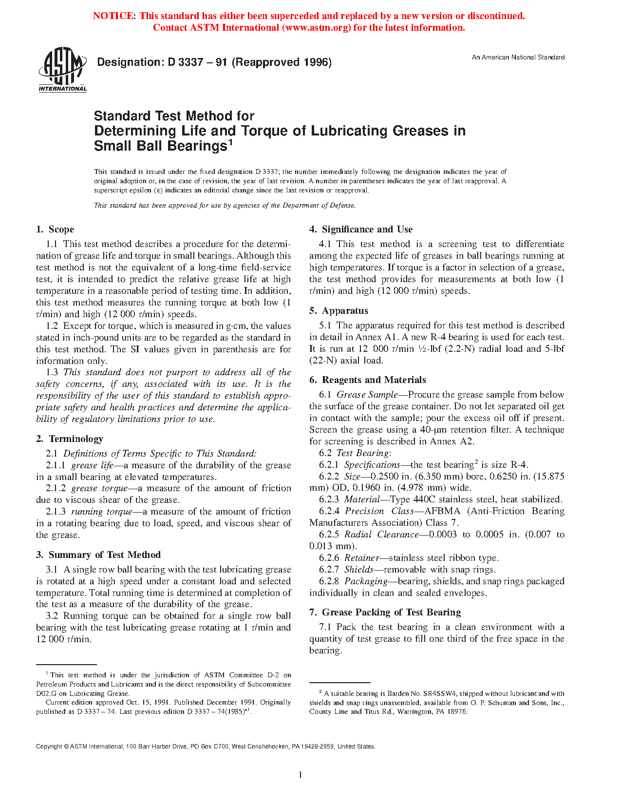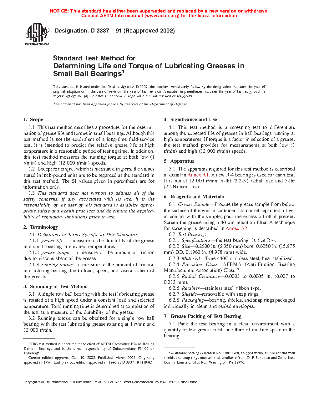 This test method is a screening test to differentiate among the expected life of greases in ball bearings running at high temperatures. If torque is a factor in selection of a grease, the test method provides for measurements at both low (1 r/min) and high (12 000 r/min) speeds.