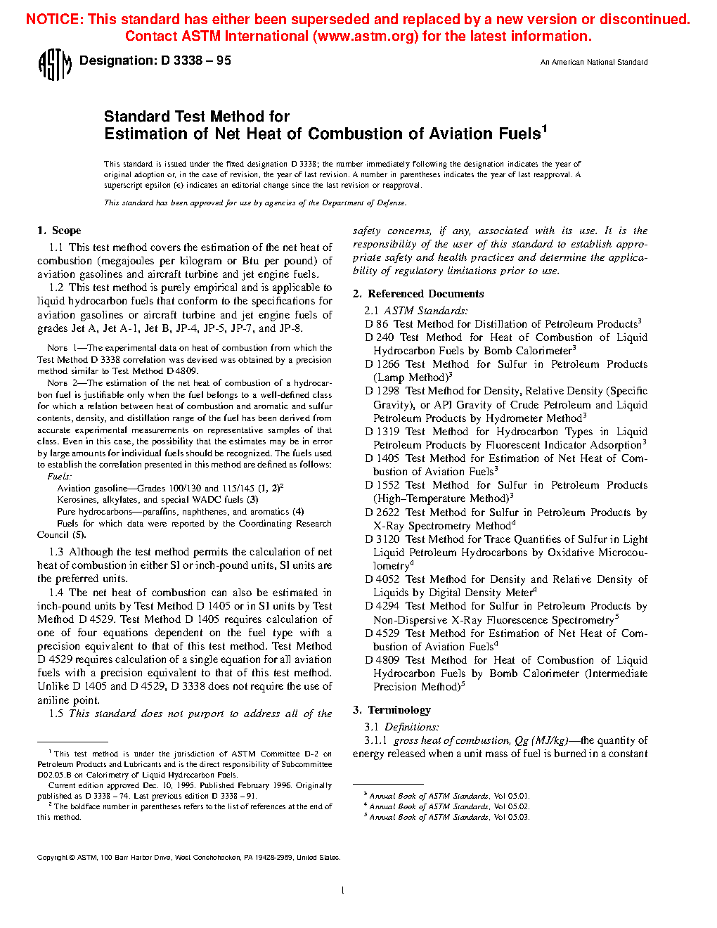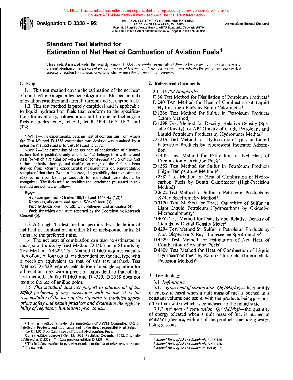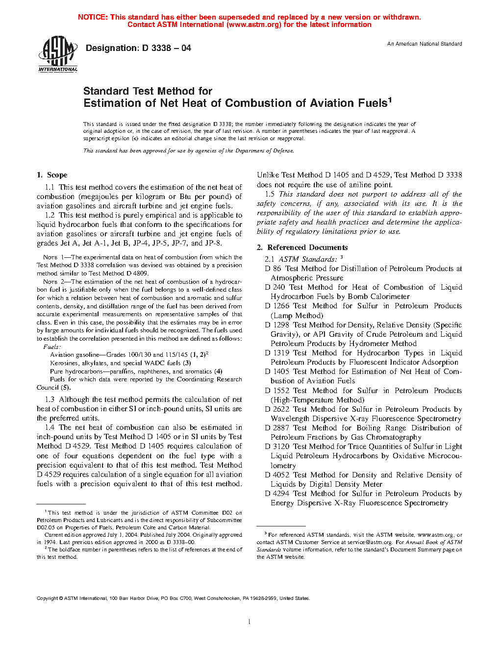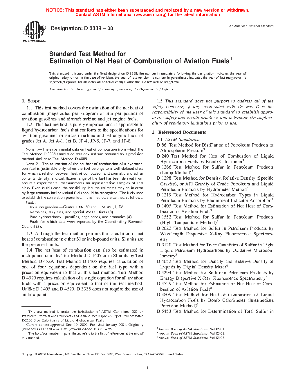 1.1 This test method covers the estimation of the net heat of combustion (megajoules per kilogram or Btu per pound) of aviation gasolines and aircraft turbine and jet engine fuels.