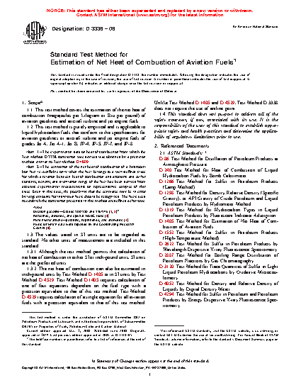 1.1 This test method covers the estimation of the net heat of combustion (megajoules per kilogram or [Btu per pound]) of aviation gasolines and aircraft turbine and jet engine fuels in the range from 40.19 to 44.73 megajoules per kilogram or [17 280 to 19 230 Btu per pound]. The precision for estimation of the net heat of combustion outside this range has not been determined for this test method.