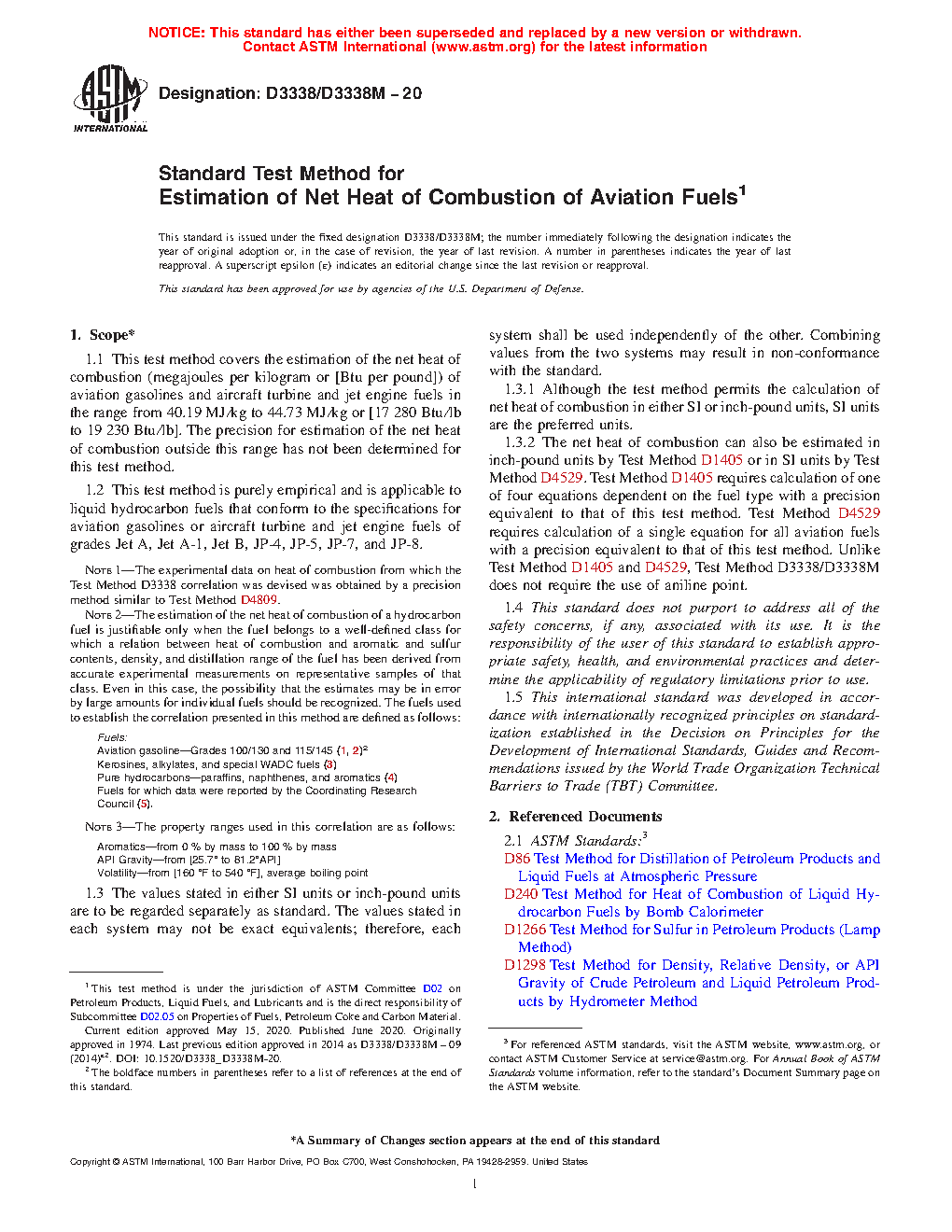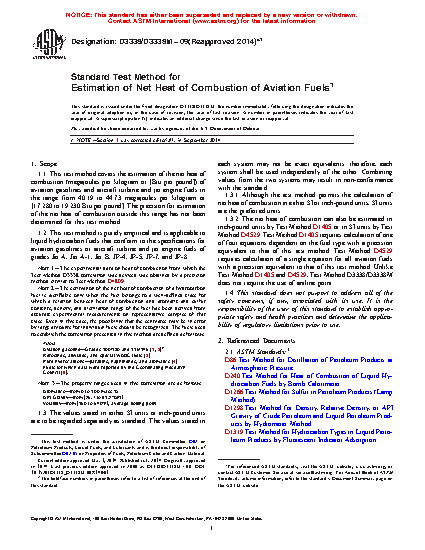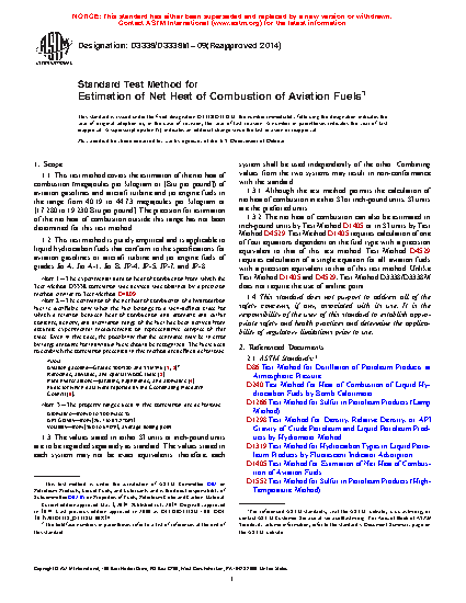 1.3.2 The net heat of combustion can also be estimated in inch-pound units by Test Method D1405 or in SI units by Test Method D4529. Test Method D1405 requires calculation of one of four equations dependent on the fuel type with a precision equivalent to that of this test method. Test Method D4529 requires calculation of a single equation for all aviation fuels with a precision equivalent to that of this test method. Unlike Test Method D1405 and D4529, Test Method D3338/D3338M does not require the use of aniline point.