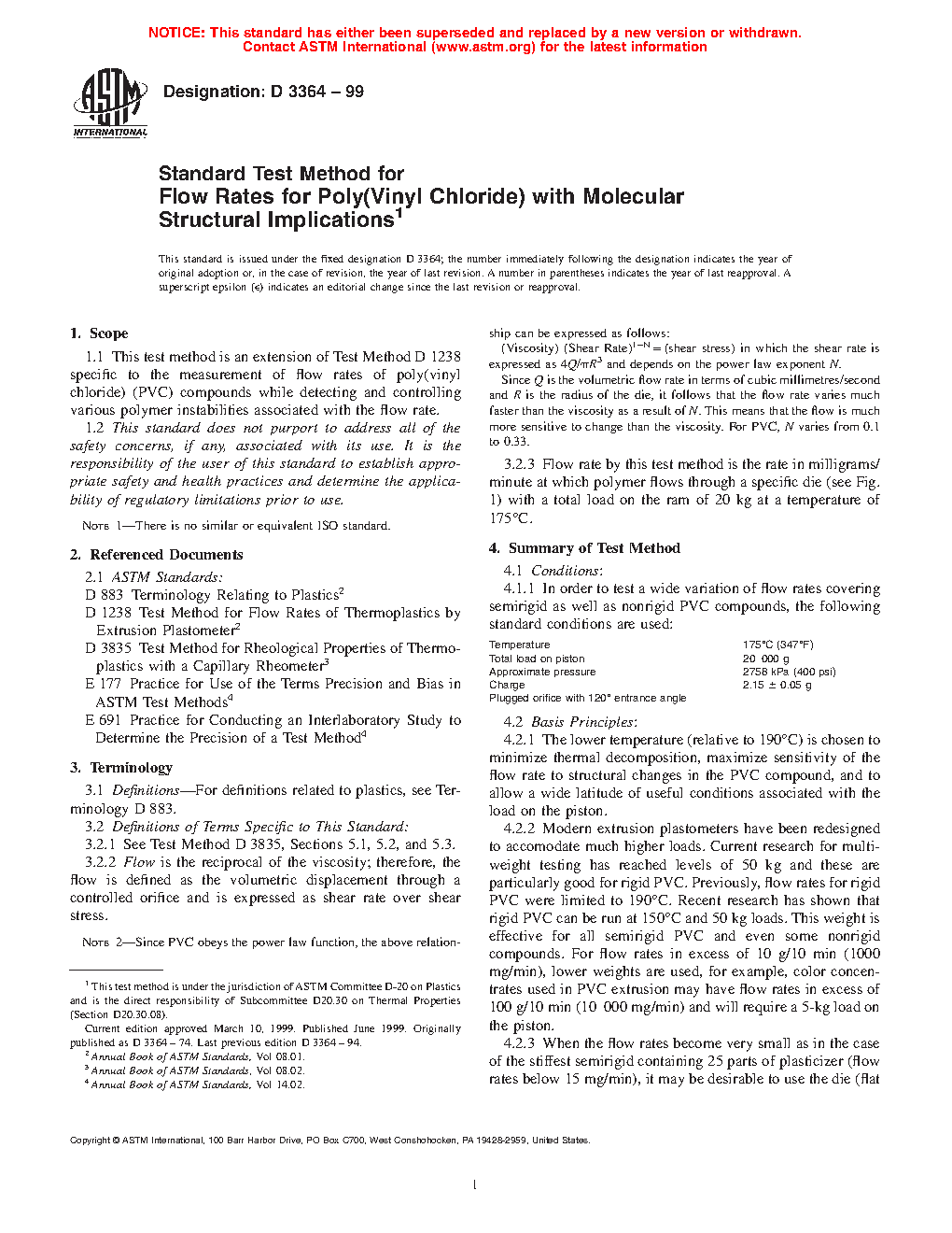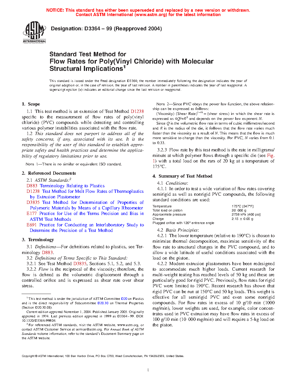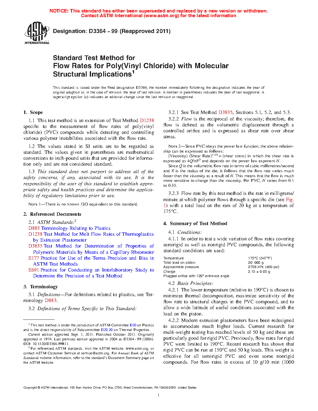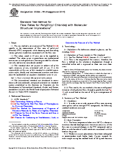 1.1 This test method is an extension of Test Method D1238 specific to the measurement of flow rates of non-rigid poly(vinyl chloride) (PVC) compounds while detecting and controlling various polymer instabilities associated with the flow rate.