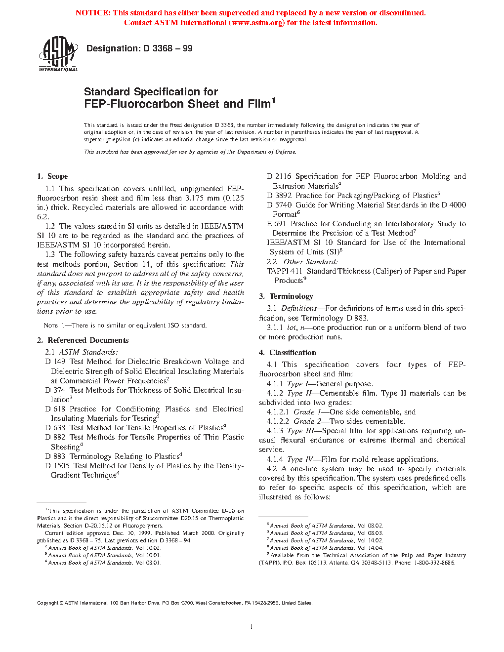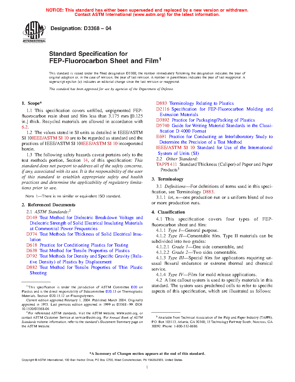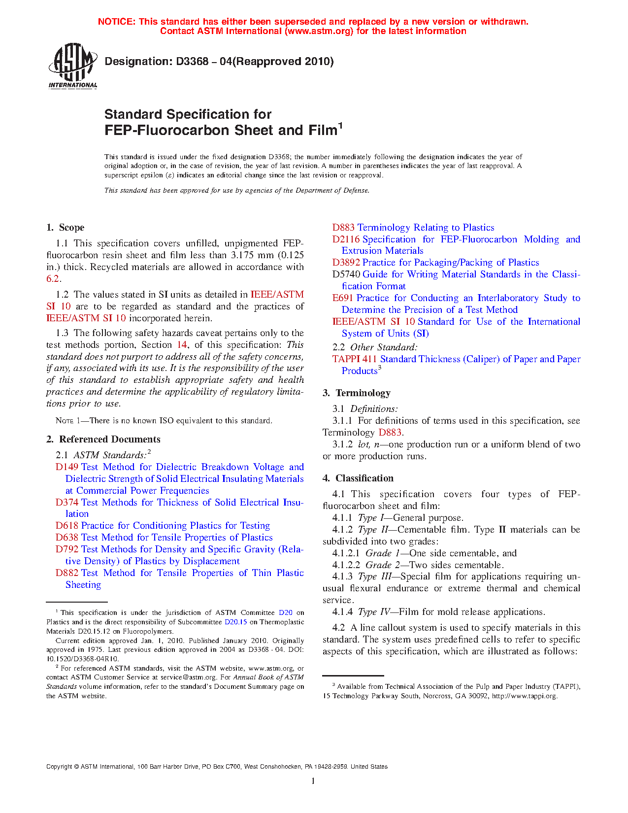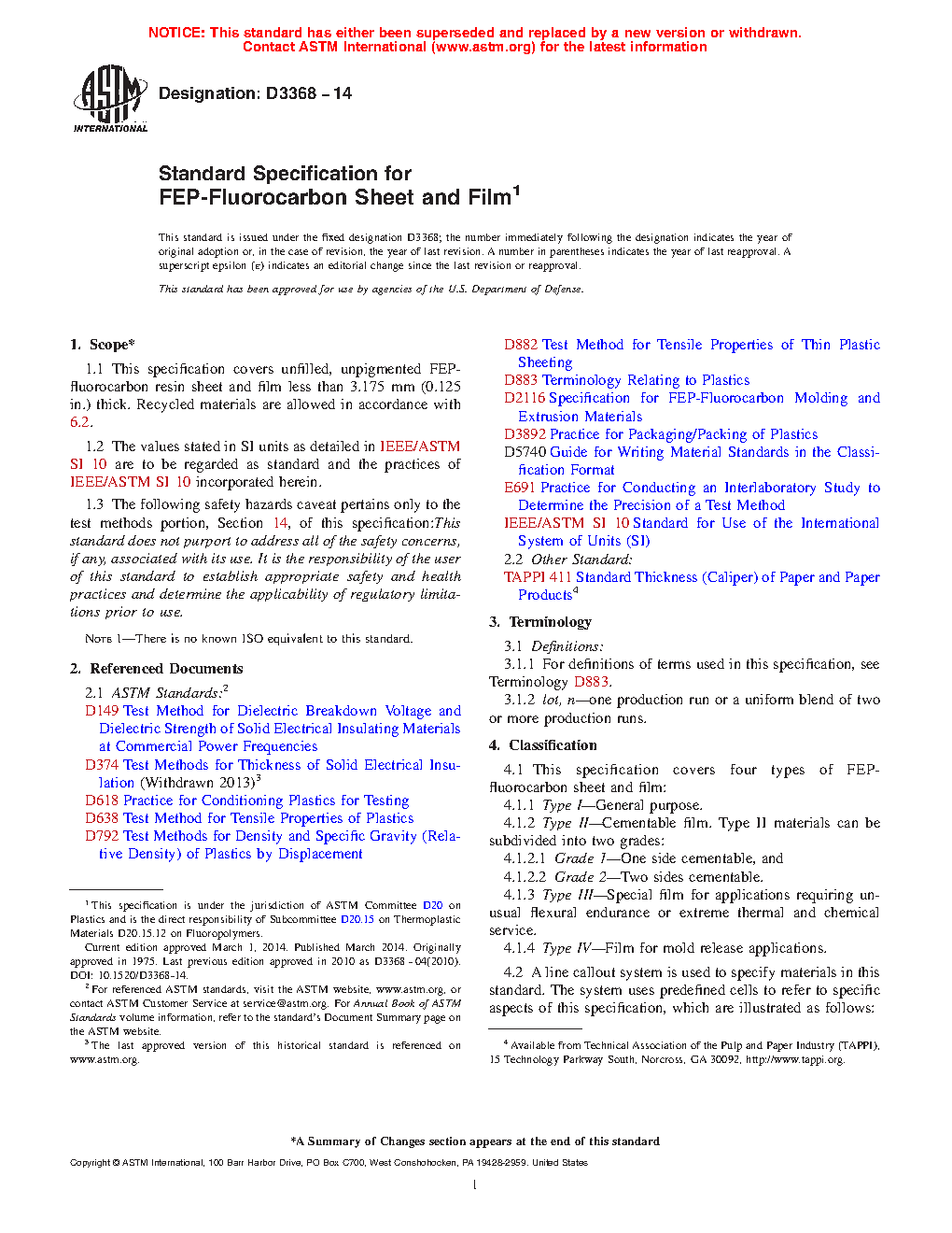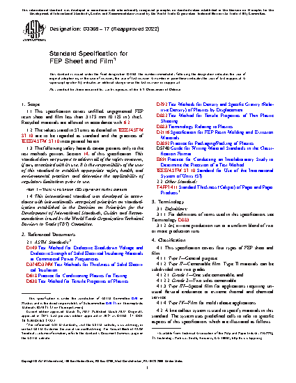 1.1 This specification covers unfilled, unpigmented FEP-fluorocarbon resin sheet and film less than 3.175 mm (0.125 in.) thick. Recycled materials are allowed in accordance with 6.2.
