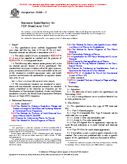 This specification covers unfilled, unpigmented FEP-fluorocarbon resin sheet and film. The sheet and film shall be made from FEP-fluorocarbon resin without filler or plasticizer. This specification allows for the use of recycled, reprocessed, and reworked FEP materials provided that: the final physical, mechanical, and performance requirements are met; and the toxicological characteristics are essentially unaltered from that of virgin material. The tensile strength, elongation at break, dimensional change on heating, cementability, dielectric strength, and density of the sheet and film shall be tested.