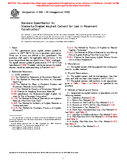 This specification covers three sets of physical requirement limits for asphalt cements graded by viscosity at a specified temperature for use in pavement construction. The purchaser shall indicate the applicable table of limits. The cements shall be prepared from crude petroleum by suitable methods, and if needed, volume corrections should be made as well. The properties for which the materials shall be tested on and should conform to are water content, viscosity, penetration, Cleveland open cup flash point, solubility in trichloroethylene, ductility, and behavior during thin-film oven and rolling thin-film oven tests on residue.