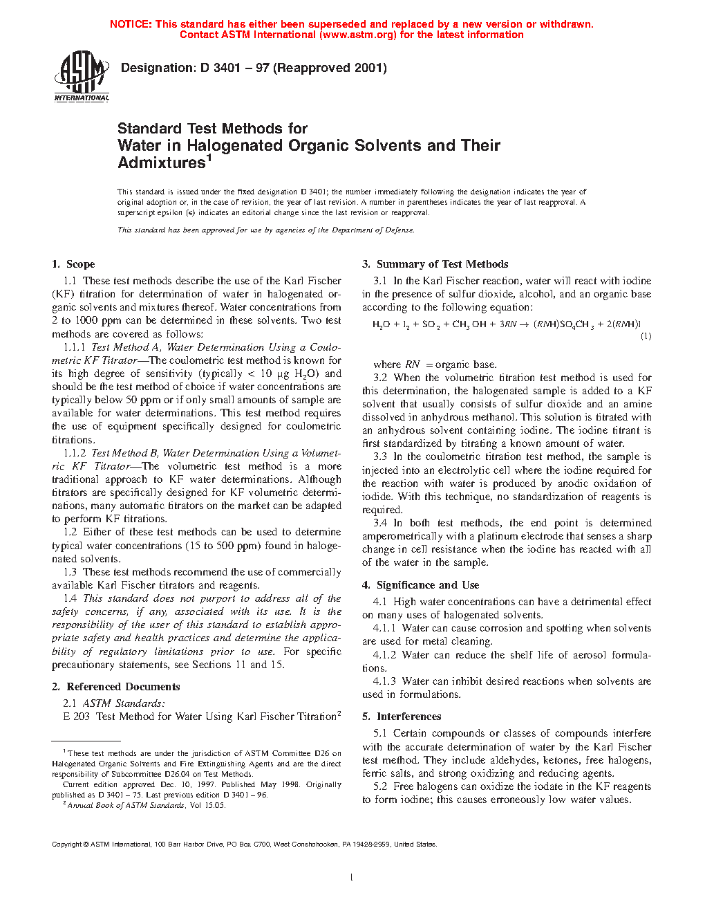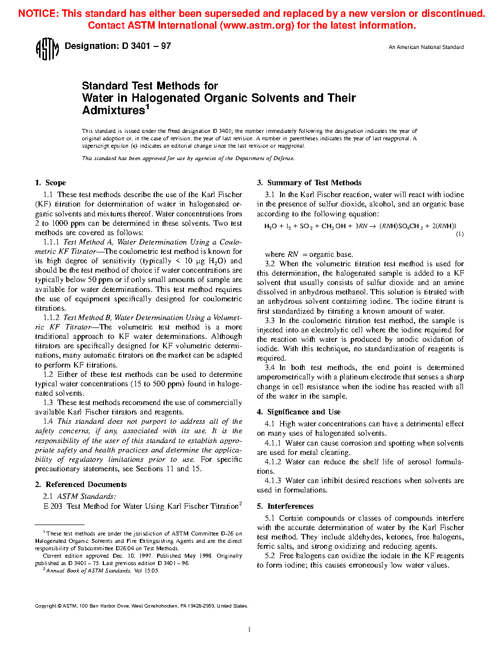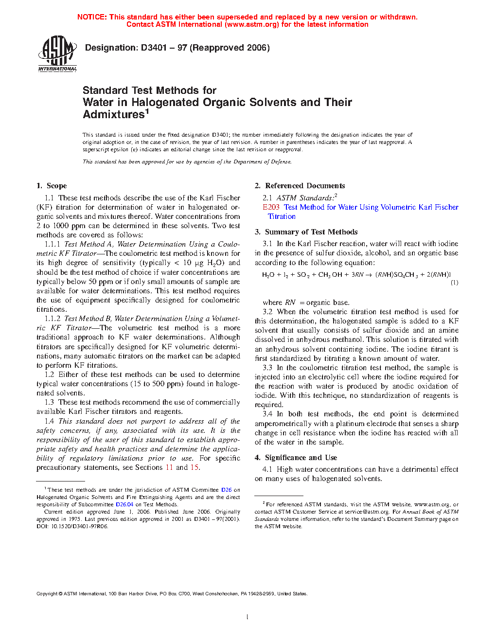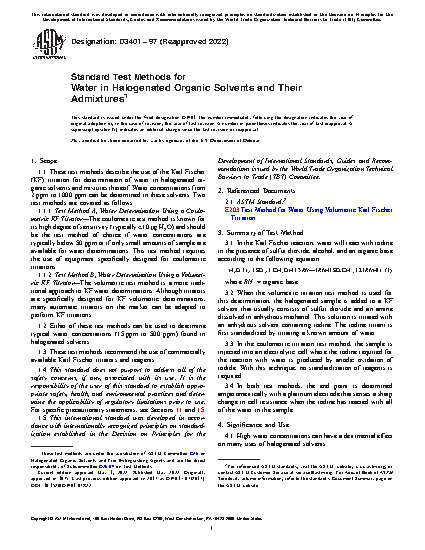 1.1 These test methods describe the use of the Karl Fischer (KF) titration for determination of water in halogenated organic solvents and mixtures thereof. Water concentrations from 2 ppm to 1000 ppm can be determined in these solvents. Two test methods are covered as follows: