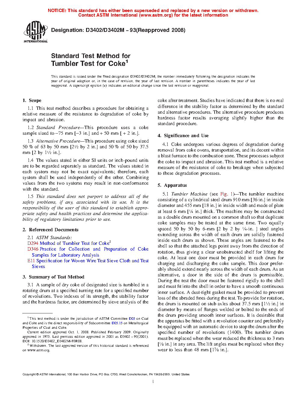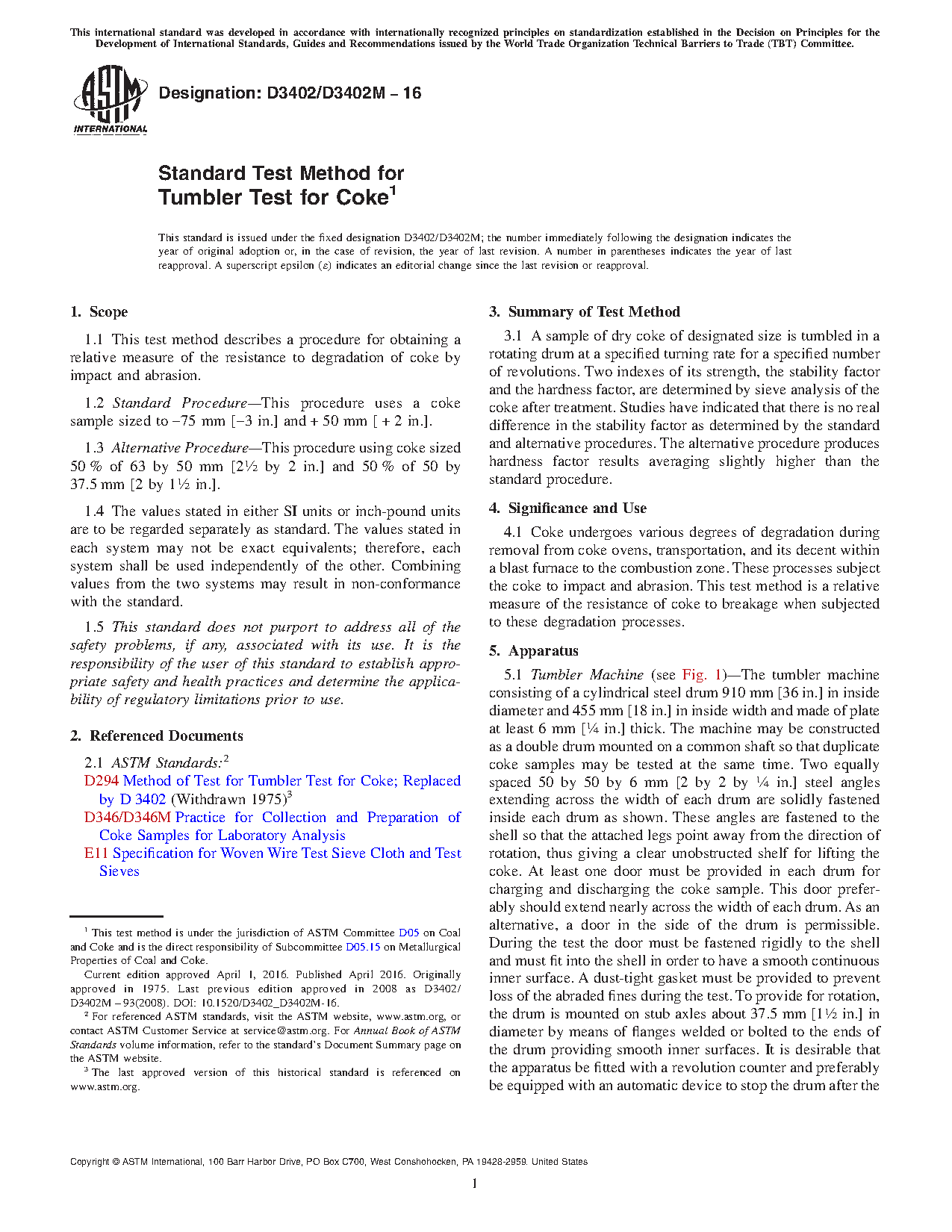 1.3 Alternative Procedure—This procedure using coke sized 50 % of 63 by 50 mm [21/2 by 2 in.] and 50 % of 50 by 37.5 mm [2 by 11/2 in.].