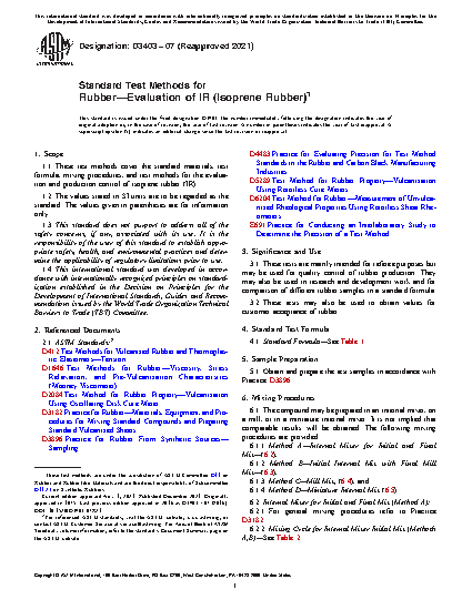 1.1 These test methods cover the standard materials, test formula, mixing procedures, and test methods for the evaluation and production control of isoprene rubber (IR).