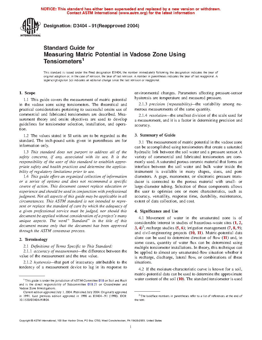 1.1 This guide covers the measurement of matric potential in the vadose zone using tensiometers. The theoretical and practical considerations pertaining to successful onsite use of commercial and fabricated tensiometers are described. Measurement theory and onsite objectives are used to develop guidelines for tensiometer selection, installation, and operation.