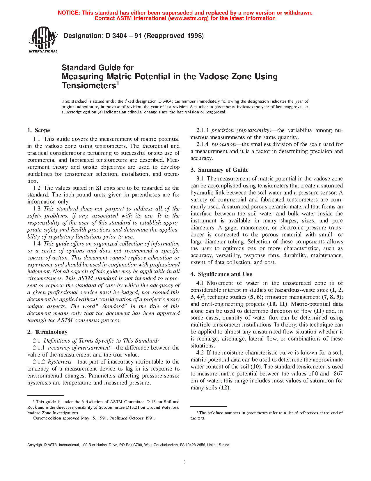 5.1 Movement of water in the unsaturated zone is of considerable interest in studies of hazardous-waste sites (1, 2, 3, 4)3; recharge studies (5, 6); irrigation management (7, 8, 9); and civil-engineering projects (10, 11). Matric-potential data alone can be used to determine direction of flow (11) and, in some cases, quantity of water flux can be determined using multiple tensiometer installations. In theory, this technique can be applied to almost any unsaturated-flow situation whether it is recharge, discharge, lateral flow, or combinations of these situations.