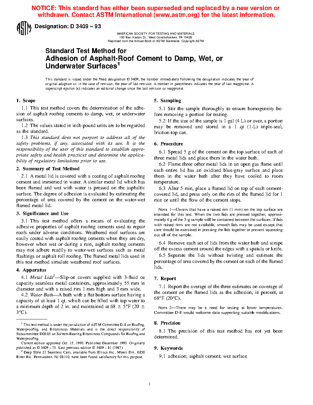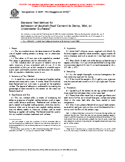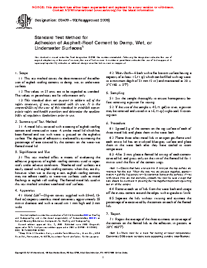 This test method offers a means of evaluating the adhesive properties of asphalt roofing cements used to repair roofs under adverse conditions. Weathered roof surfaces are easily coated with asphalt roofing cements when they are dry, however when wet or during a rain, asphalt roofing cements may not adhere readily to water-wet surfaces such as metal flashings or asphalt roll roofing. The flamed metal lids used in this test method simulate weathered roof surfaces.